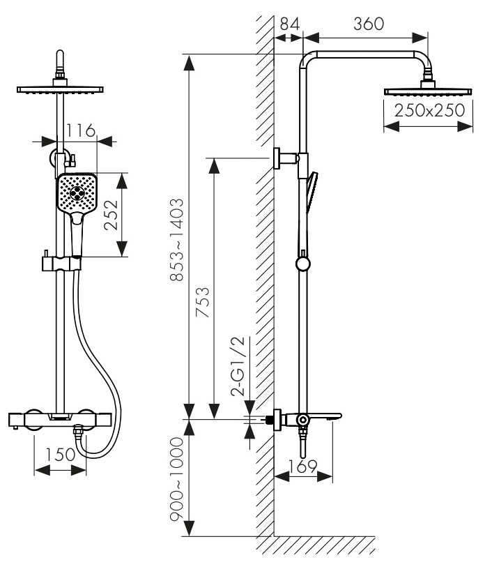 смеситель, релинг, верхний душ, душевая лейка, держатель лейки, шланг, крепления |