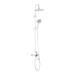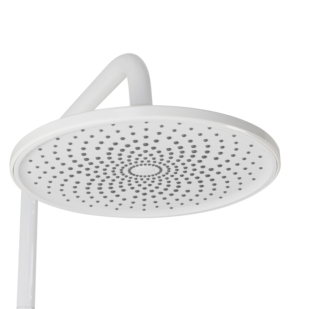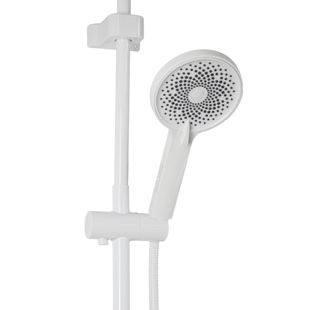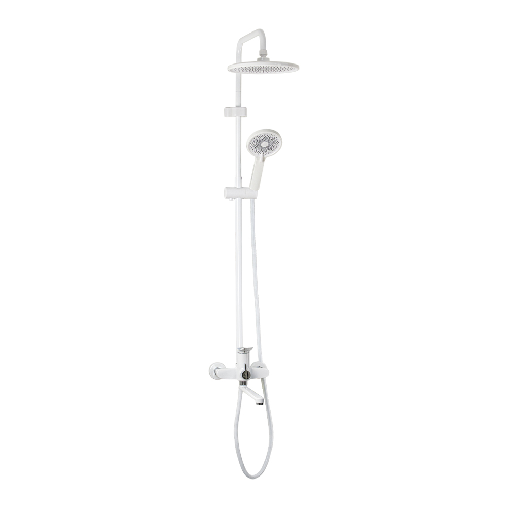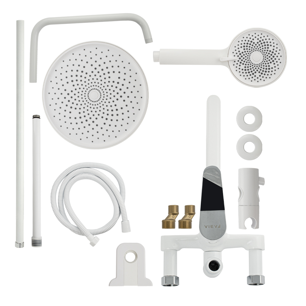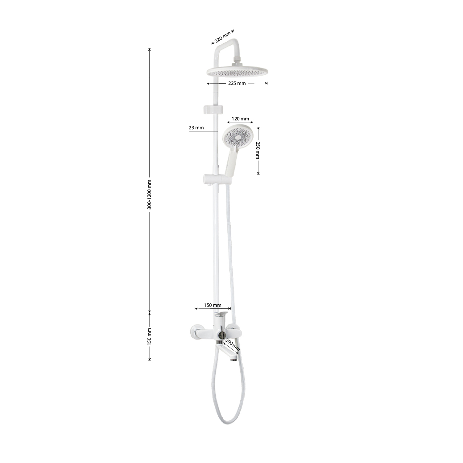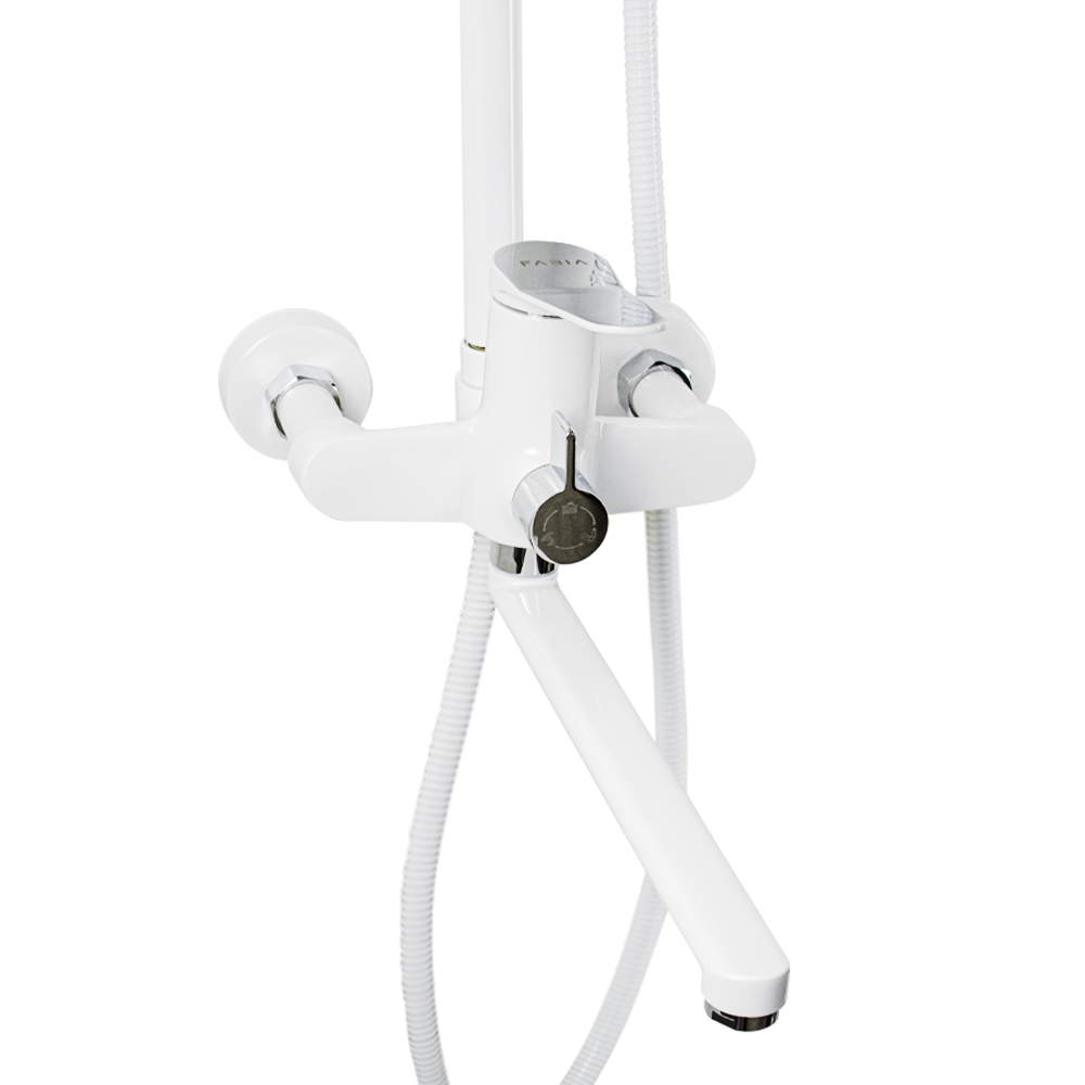 Смеситель + стойка душевая телескопическая “тропический душ” с двумя лейками в ванную / душевую комнату, хромированный с покрытием белая эмаль. Смеситель шаровый с длинным поворотным изливом, душевым шлангом и лейкой, дивертор переключения в трёх положениях. Материал изготовления — латунь. Картридж d = 40 мм, ручка литая, аэратор для экономии воды, чашки и эксцентрики. Душевая, регулируемая по высоте стойка с присоединением к корпусу смесителя и дополнительным креплением к стене и большой круглой лейкой с эффектом тропического душа. Габаритные размеры: ширина смесителя 150 мм, высота 150 мм, длина излива корпуса 300 мм, высота телескопической стойки 800-1200 мм, длина излива стойки 320 мм, круглая душевая лейка 120 мм, круглая лейка тропический душ 225 мм, шланг 150 см. Вес – 4.12 кг, объём – 0.02847 м3. В комплекте корпус с изливом, чашки, эксцентрики, прокладки, стойка, дивертор, шланг, две лейки, крепления.