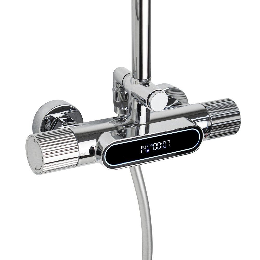 Смеситель термостатический с дисплеем + стойка душевая телескопическая “тропический душ” – надежное сантехническое оборудование. Хромированный круглый корпус без излива, с функцией водопад. Температура и напор воды устанавливаются поворотом двух удобных рукояток. Термостат поддерживает заданную температуру воды и может работать в системах низкого давления с газовыми проточными водонагревателями. Ограничитель температуры до 38 градусов спасает от возможного ожога при случайном повороте рукоятки. Встроенный аэратор формирует комфортный и приятный поток воды. Сеточка легко снимается для удаления налета. Аксессуар оснащен термостатическим картриджем с шумоподавлением и керамической кран-буксой, стойка с двумя хромированными лейками и шлангом. Габаритные размеры: высота стойки 800-1200 мм, длина излива стойки 360 мм, лейка для душа 130 мм двухрежимная, лейка тропического душа 255 мм, глубина смесителя 100 мм, ширина смесителя 150 мм, высота смесителя 95 мм, шланг 150 см. Вес – 4.11 кг, объём – 0.02941 м3.