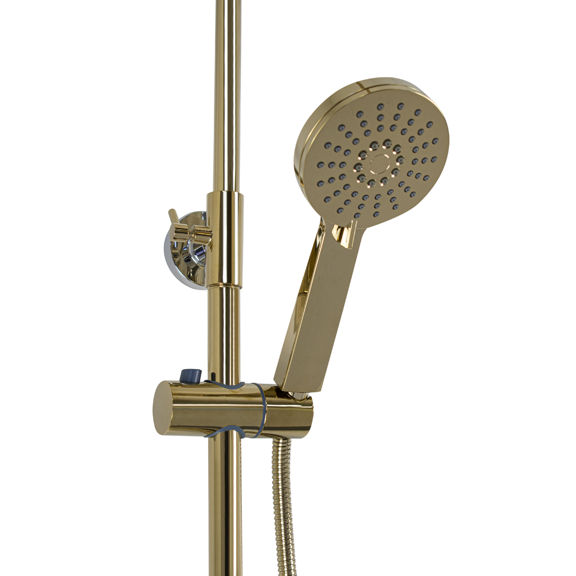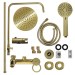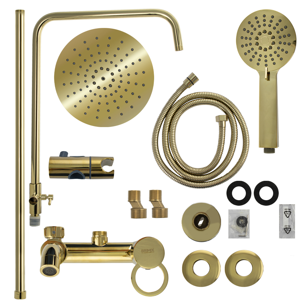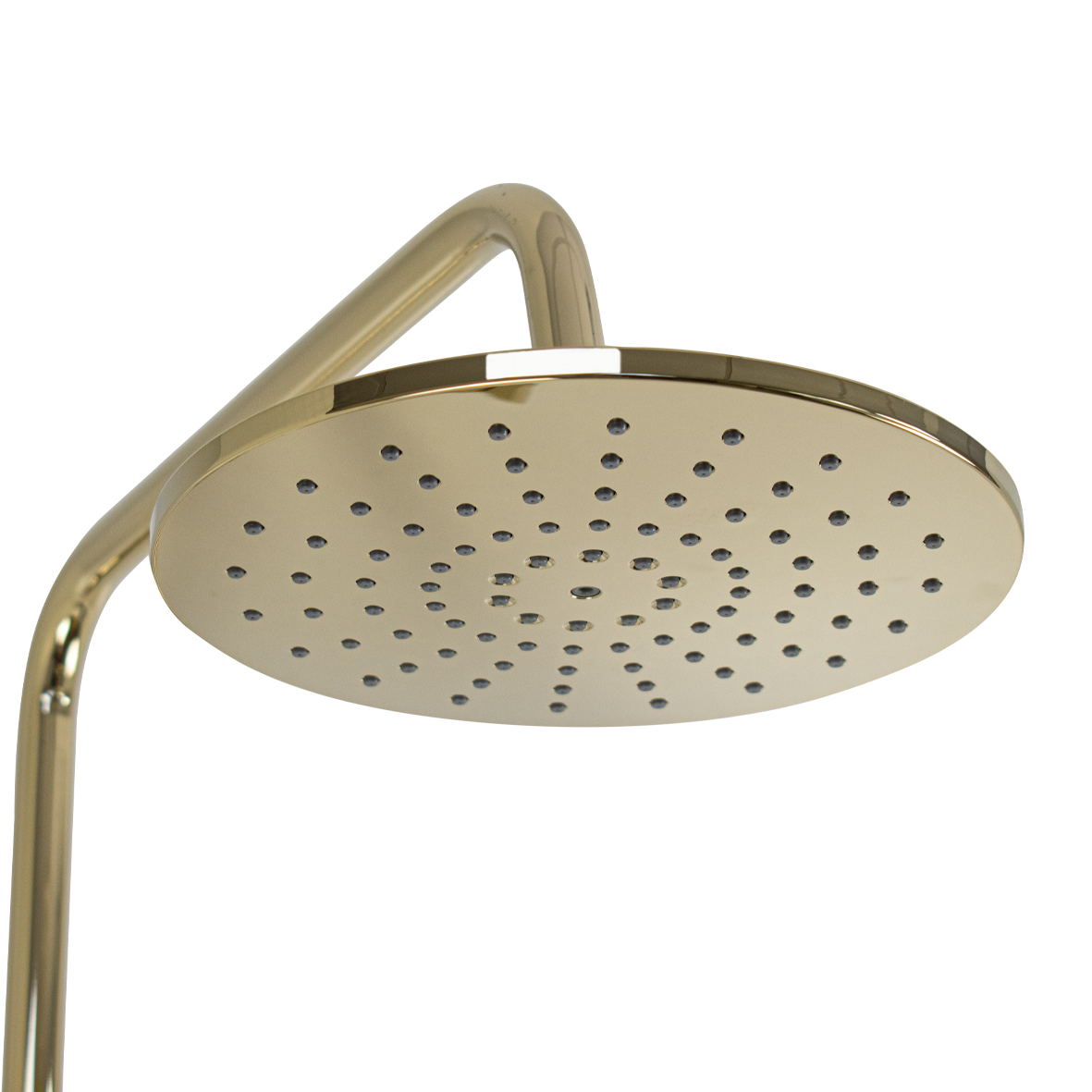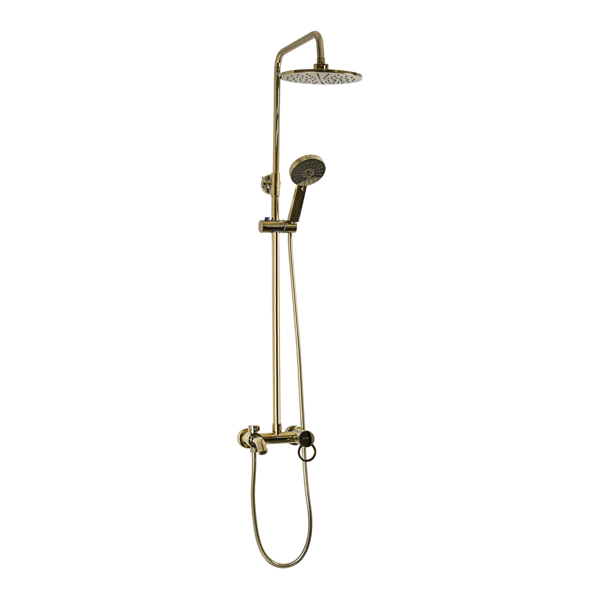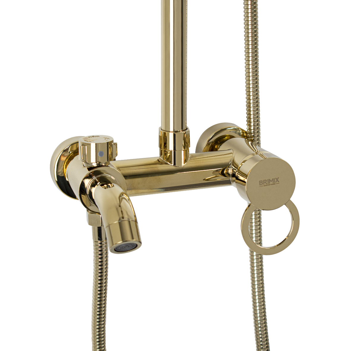 Смеситель стойка душевая “тропический душ” с двумя лейками в ванную, цвет под золото. В дизайне душевой стойки гармонично соединились строгие линии и мягкие переходы. Она отлично впишется в интерьер ванной комнаты в минималистическом стиле. Глянцевое покрытие под состаренную бронзу не стирается и сохраняет первозданный внешний вид в течение всего периода эксплуатации. Длительную работу без протечек обеспечивает смеситель с керамическим картриджем. Предусмотрен излив для наполнения ванны. Угол наклона верхнего душа можно регулировать в соответствии с потребностями каждого пользователя. Ручная лейка оснащена металлическим шлангом, который не перекручивается во время водных процедур. Смеситель шаровый с коротким изливом, душевым шлангом и лейкой и дивертор переключения в трёх положениях. Картридж d = 35 мм, ручка с кольцом, аэратор для экономии воды, чашки и эксцентрики. Душевая стойка с присоединением к корпусу смесителя и дополнительным креплением к стене и большой круглой лейкой с эффектом тропического душа. Габаритные размеры: ширина смесителя 150 мм, высота 100 мм, длина излива корпуса 170 мм, высота стойки 800-1100 мм, длина излива стойки 330 мм, круглая душевая лейка d = 220 мм, круглая лейка тропический душ d = 105 мм, шланг 150 см. Вес – 3,660 кг, объём – 0,03 м3. В комплекте корпус с изливом, чашки, эксцентрики, прокладки, стойка, дивертор, шланг, две лейки, крепления.