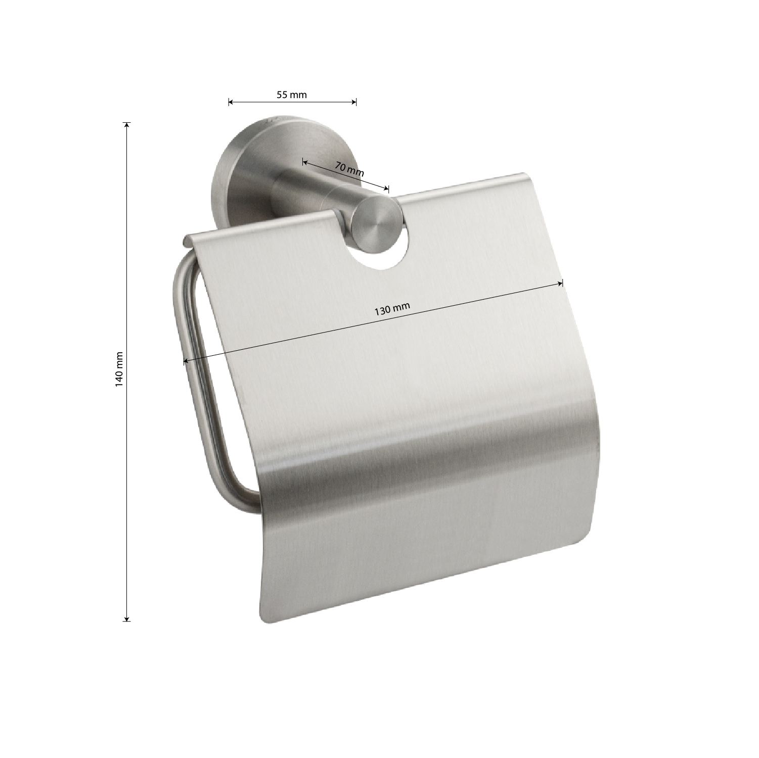 Бумагодержатель с крышкой, металлический, стильный и функциональный элемент санузла. Благодаря наличию крышки рулон будет защищен от попадания воды. Держатель для туалетной бумаги легко и удобно крепится к стене при помощи фурнитуры входящей в комплект поставки. Изготовлен из прочной нержавеющей стали марки SUS 304 с матовым покрытием, которое придает безупречный стильный вид и долговечность. Удобно чистить и легко менять рулоны. Габаритные размеры: ширина 130 мм, высота 140 мм, глубина 70 мм, основание 55 мм