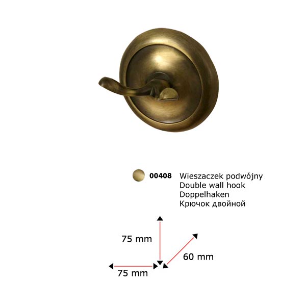 Крючок двойной. Крепится к стене шурупами. Произведено из цинкоалюминиевого сплава с покрытием цвета античной латуни._x000D_ _x000D_ Производство: Польша