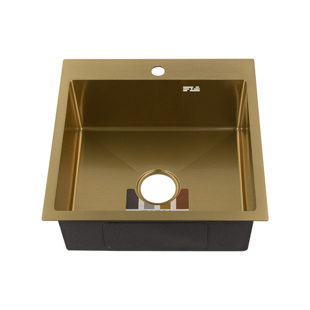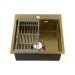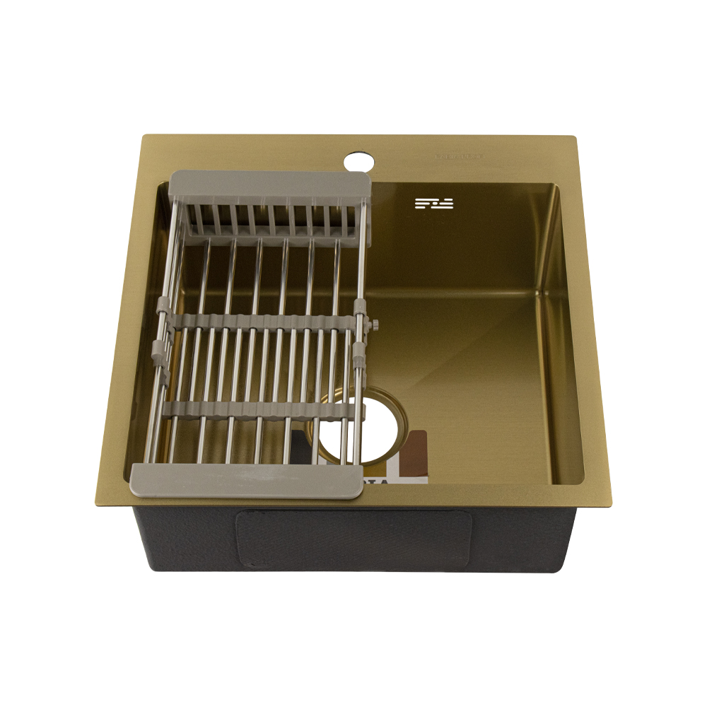 Мойка врезная, золото, большой сифон с переливом. Сифон с углубленной горловиной, мусоросборником и крышкой. Врезная кухонная мойка произведена из премиальной нержавеющей стали AISI 201, обладает повышенной прочностью. Особенность мойки заключается в конструкции ее дна, имеющего небольшой уклон. Благодаря такой особенности, вода быстрее уходит в слив, не застаивается, что способствует поддержанию гигиеничности в чаше. Скругленные внутренние углы облегчают уход за мойкой, препятствуют скоплению частичек грязи. Тихой в использовании мойку делает шумоизолирующее покрытие и накладки с обратной стороны мойки. В комплект входит универсальная раздвижная корзина, коврик, сифон, мойка, крепёж. Габаритные размеры: ширина 500 мм, длина 500 мм, глубина 200 мм, толщина основания 3,0 мм, чаша 0,8 мм. Вес – 7,500 кг, объём – 0,07000 м3.