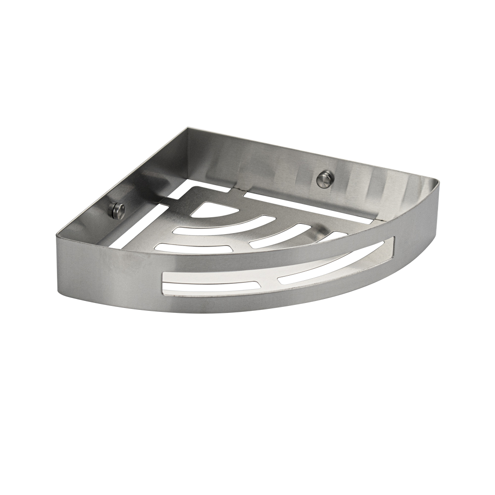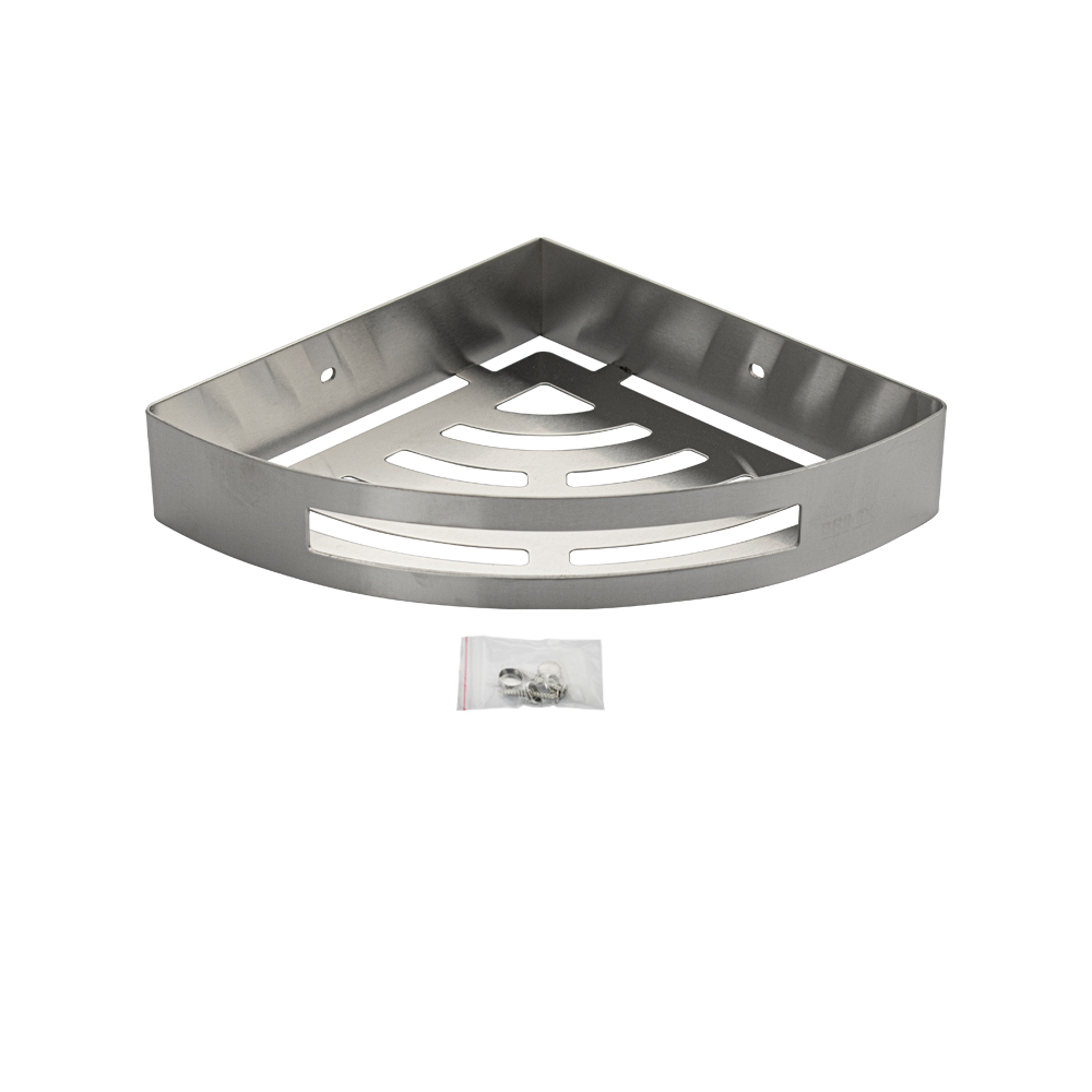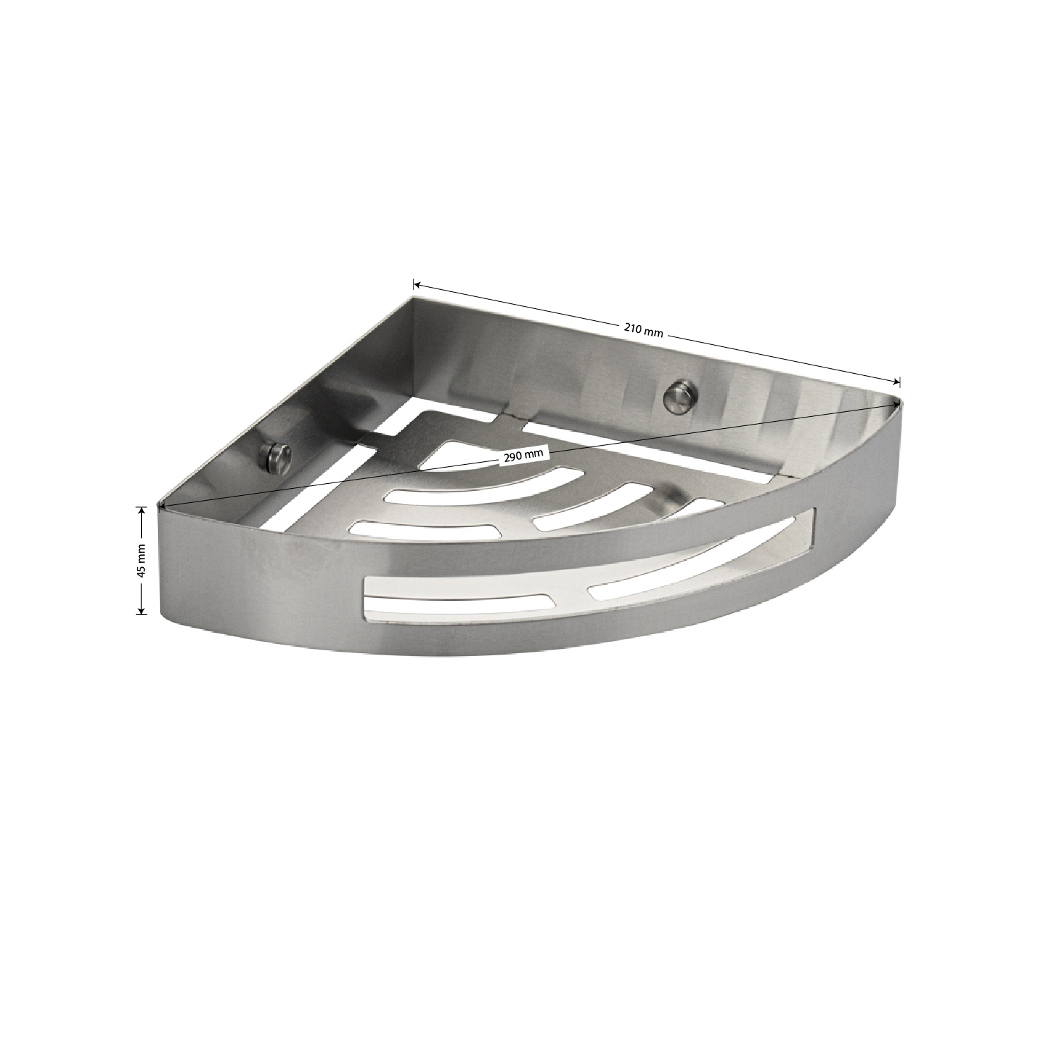 Полочка для принадлежностей, угловая, с литым дном, одноэтажная, обладает высокими эксплуатационными характеристиками и подходит для использования дома, в общественных местах: отелях, ресторанах и пр. Изготовлена из прочной нержавеющей стали с матовым покрытием, которое придает безупречный внешний вид и долговечность. Аксессуар не занимает много места, надежно фиксируется к стене при помощи набора креплений (входят в комплект) и служит удобным местом для хранения бытовых и косметических средств. Габаритные размеры: высота 45 мм, ширина 290 мм, глубина 210 мм. Вес – 0,690 кг, объём – 0,004 м