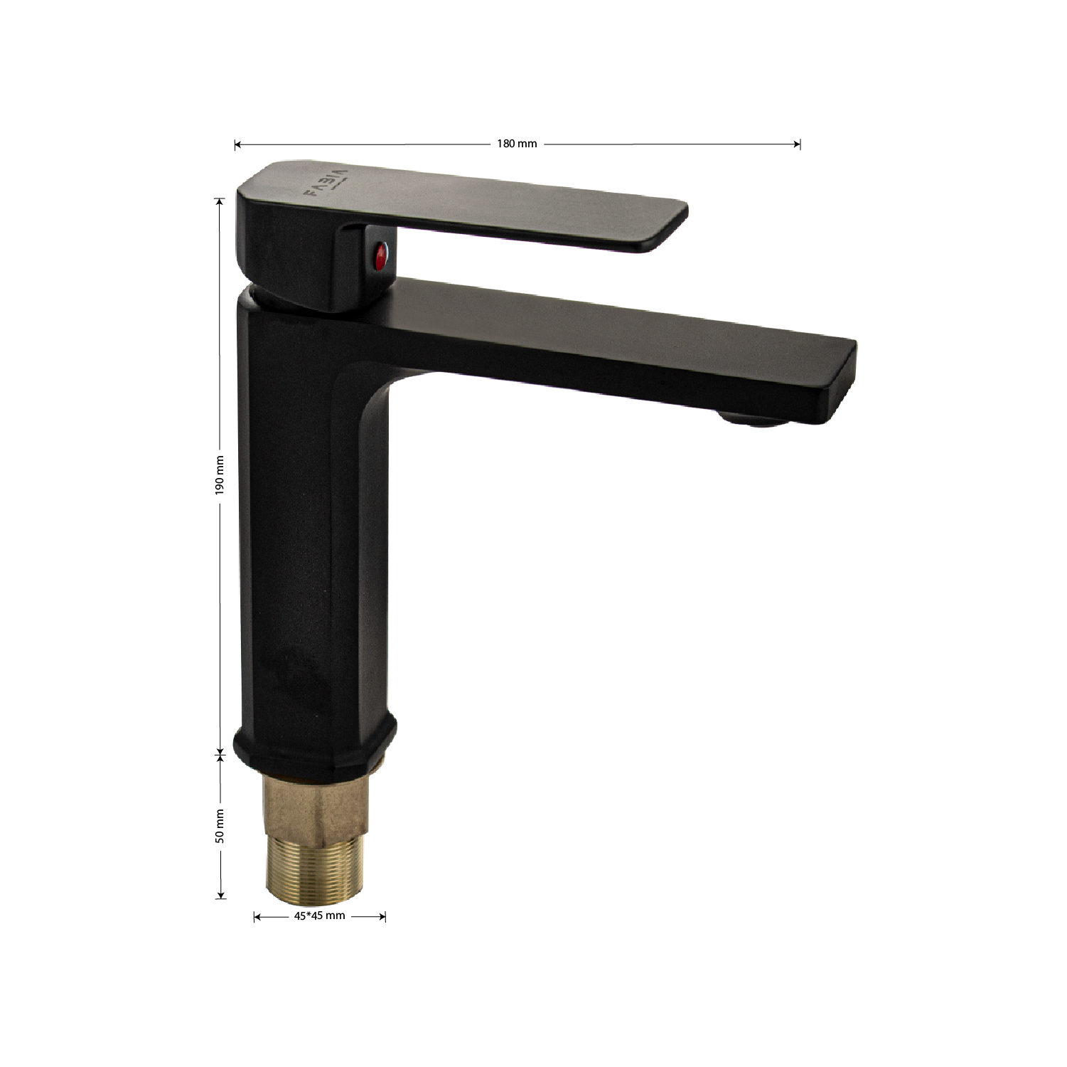 Смеситель для раковины, квадратный литой корпус, цвет черный, с прямым плоским изливом, ручка литая, шаровый. Крепление резьба – гайка, картридж d = 35 мм. Аэратор для экономии воды. Такая модель может использоваться на домашней кухне, на даче, в медицинских учреждениях и общественных местах. Габаритные размеры: высота 190 мм, длина 180 мм, посадочное седло 45 мм, длина резьбы 50 мм, длина подводки 500 мм. Вес – 1,45 кг, объём – 0,00307 м3. В комплекте паспорт, корпус, подводка 1/2, крепеж, набор прокладок.