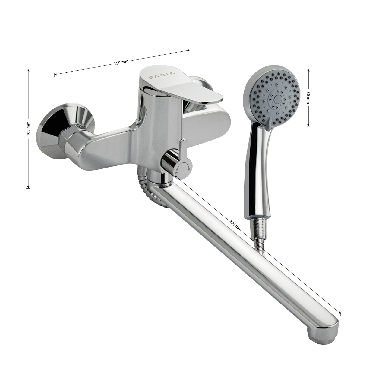 Смеситель хромированный в ванную / душевую комнату с длинным, плоским изливом, тяжёлый, массивный корпус, шаровый, с дивертором м/к на корпусе. Материал изготовления — ЦАМ (цинк-алюминий-медь) + нержавеющая сталь. Картридж d = мм, литая ручка, аэратор для экономии воды, чашки и эксцентрики из нержавеющей стали. Габаритные размеры: ширина 150 мм, высота корпуса 160 мм, длина излива 290 мм, душевая лейка 80 мм, шланг 150 см. Вес – 1,65 кг, объём – 0,00521 м3. В комплекте паспорт, корпус с изливом, дивертор, душевая лейка, шланг, кронштейн, комплект крепежа и прокладок.