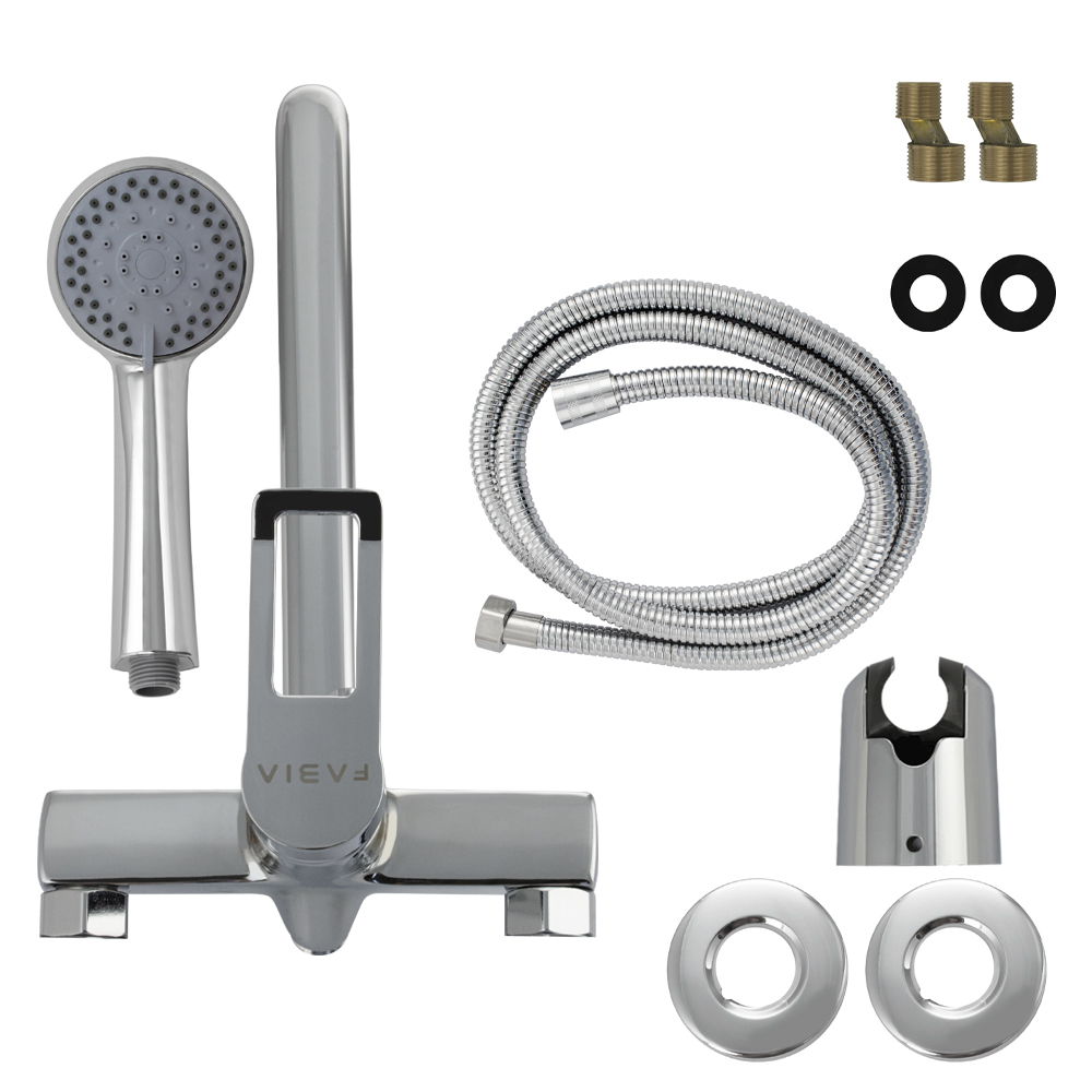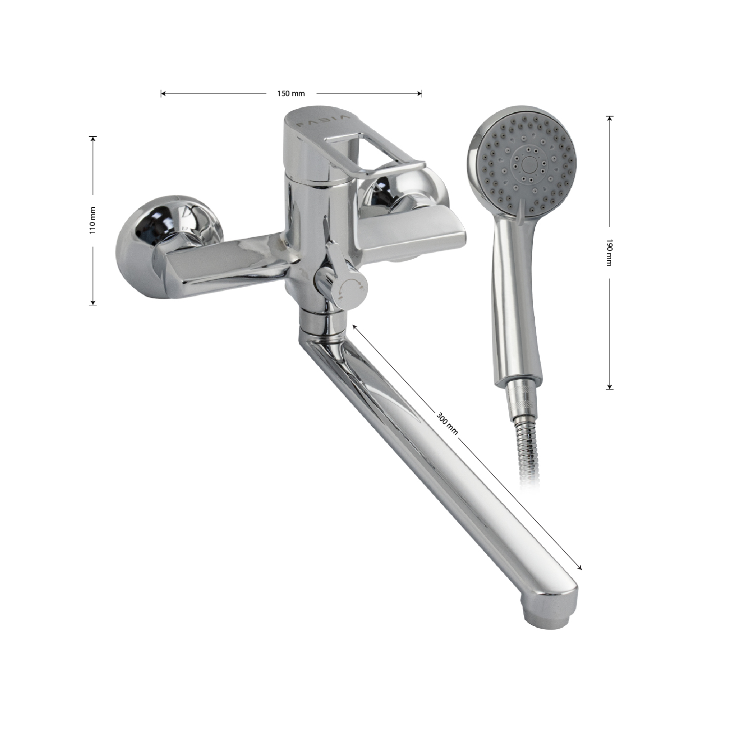 Смеситель хромированный в ванную / душевую комнату с длинным, плоским изливом, тяжёлый, массивный корпус, шаровый, с дивертором м/к на корпусе. Материал изготовления — ЦАМ (цинк-алюминий-медь) + нержавеющая сталь. Картридж d = 35 мм, плоская ручка с декоративным вырезом, аэратор для экономии воды, чашки и эксцентрики из нержавеющей стали. Габаритные размеры: ширина 150 мм, высота корпуса 110 мм, длина излива 300 мм, душевая лейка 2 режима 190 мм, шланг 150 см. Вес – 1,500 кг, объём – 0,0048 м3. В комплекте паспорт, корпус с изливом, дивертор, душевая лейка, шланг, кронштейн, комплект крепежа и прокладок.