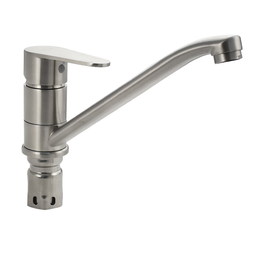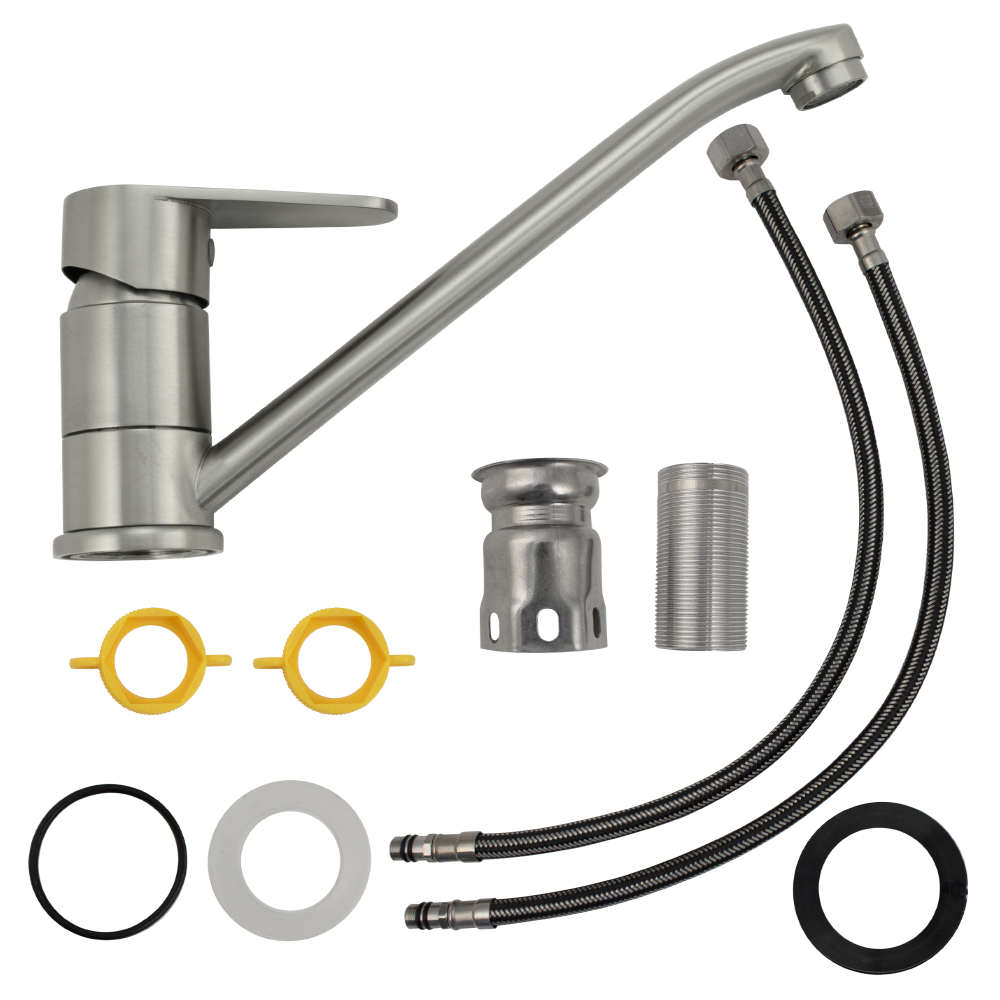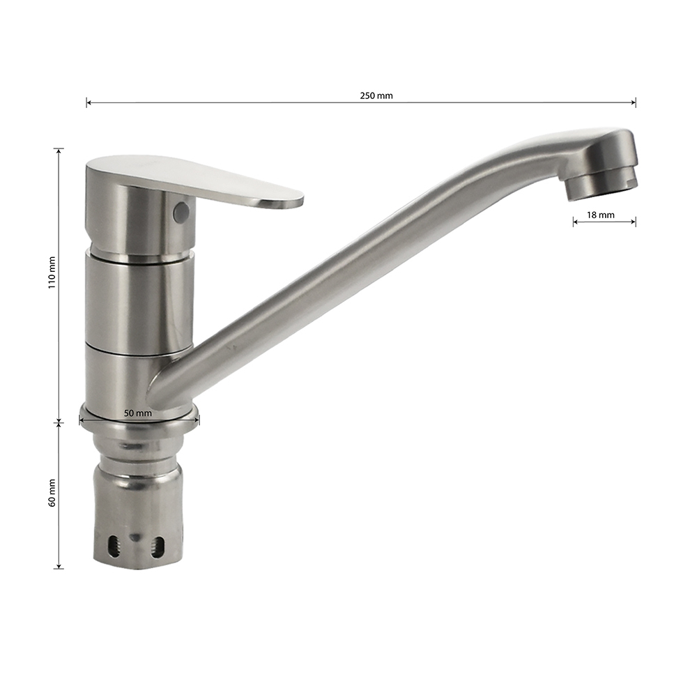 Смеситель для кухонной мойки и раковин, литой матовый корпус с длинным, поворотным изливом 25 см, из нержавеющей стали марки 304, шаровый. Крепление резьба – гайка, картридж d = 40 мм, ручка литая. Аэратор для экономии воды. Такая модель может использоваться на домашней кухне, на даче, в медицинских учреждениях и общественных местах. Габаритные размеры: высота 110 мм, длина 250 мм, длина излива 220 мм, диаметр посадочного седла 50 мм, длина резьбы 60 мм, длина подводки 450 мм. Вес –  1,200 кг, объём – 0,00319 м3. В комплекте паспорт, корпус с изливом, подводка 1/2, крепеж, набор прокладок.