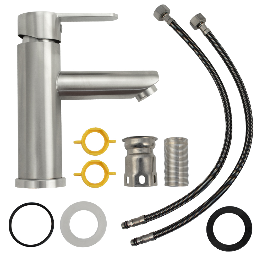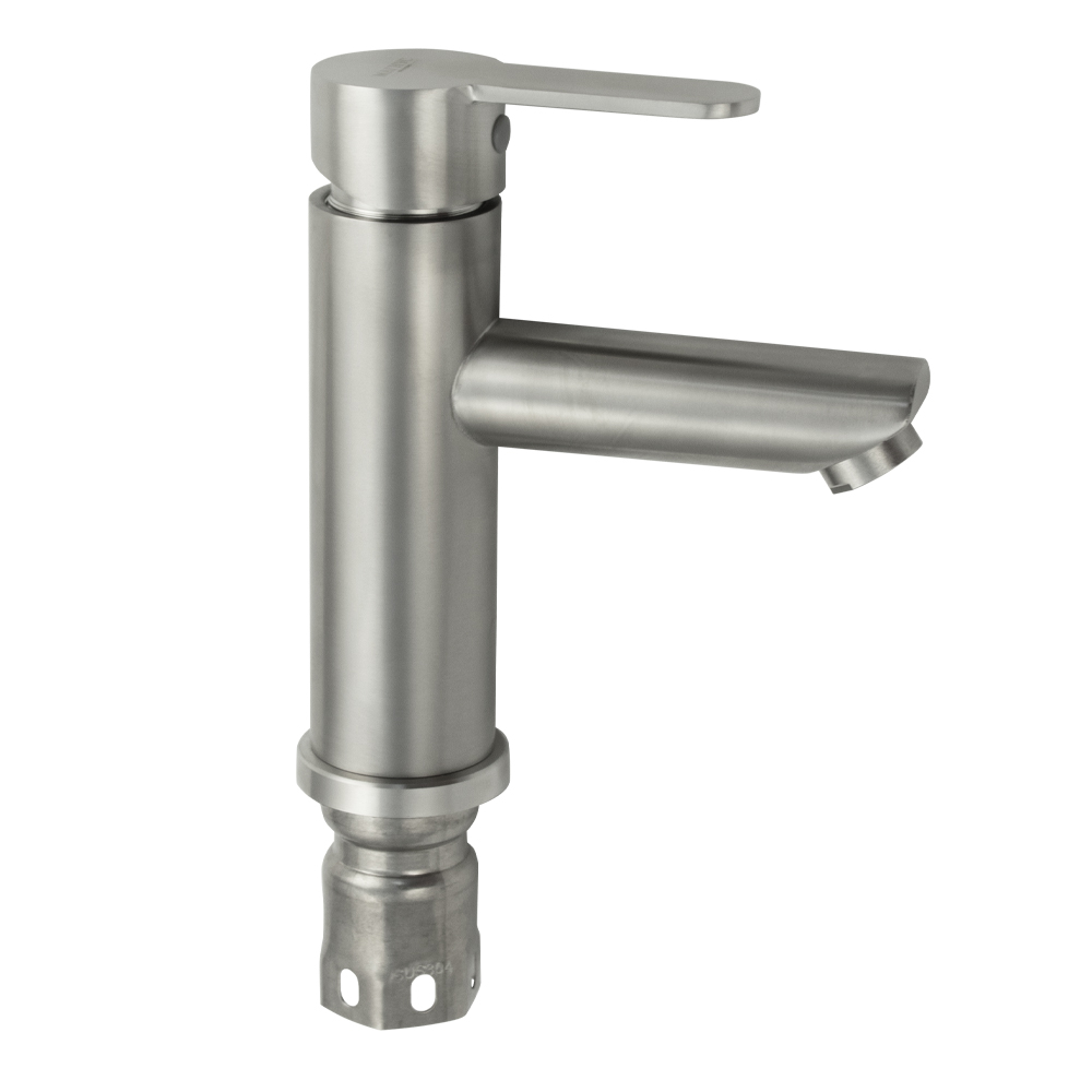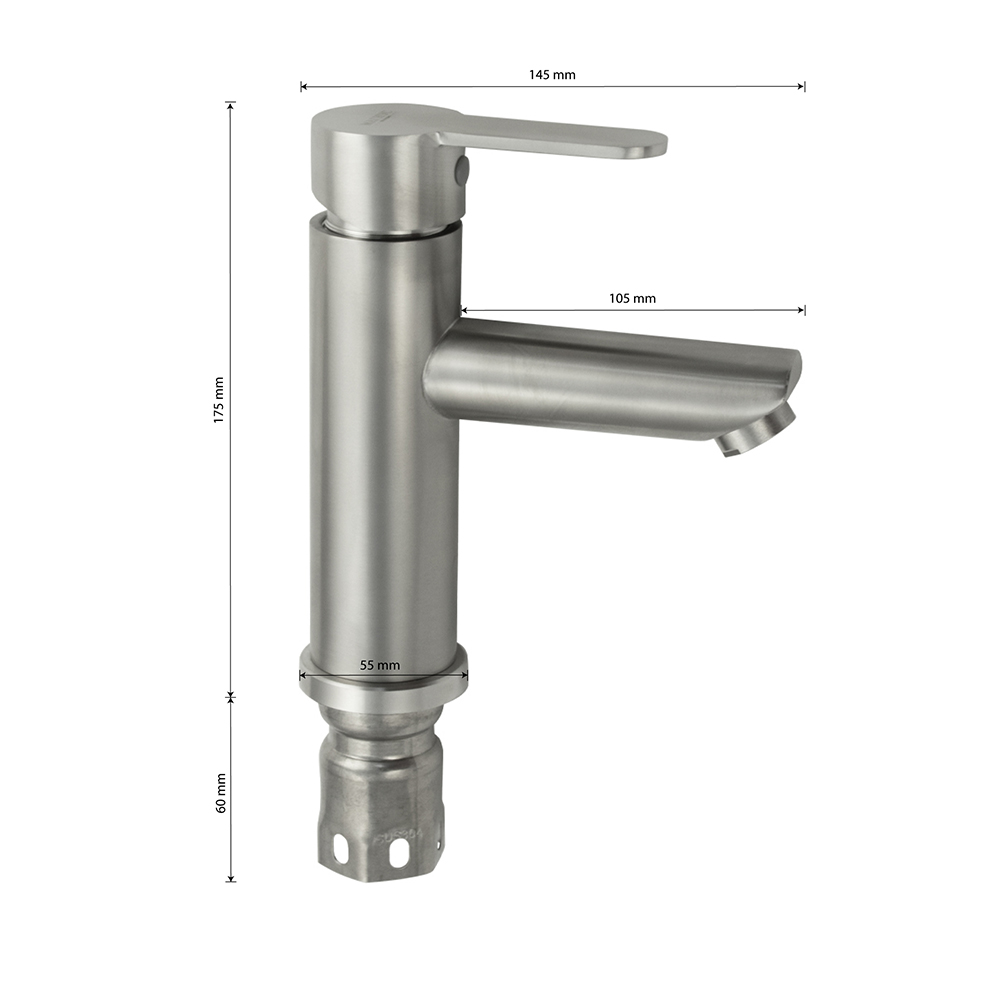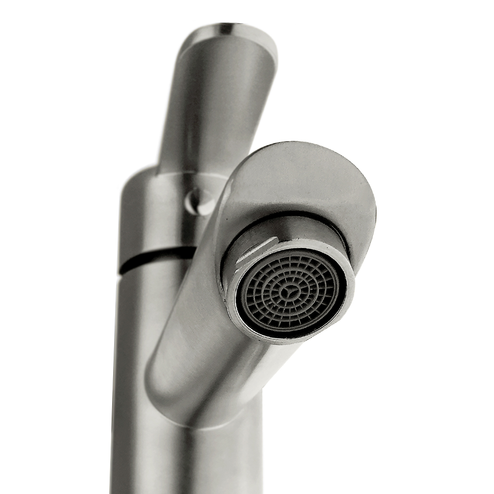 Смеситель для раковины, матовый литой корпус, из нержавеющей стали марки 304, с коротким литым изливом, литая ручка, шаровый. Крепление резьба – гайка, картридж d = 35 мм. Аэратор для экономии воды. Такая модель может использоваться на домашней кухне, на даче, в медицинских учреждениях и общественных местах. Габаритные размеры: высота 175 мм, длина 145 мм, длина излива 105 мм, диаметр посадочного седла 55 мм, длина резьбы 60 мм, длина подводки 450 мм. Вес – 1,000 кг, объём – 0,00308 м3. В комплекте паспорт, корпус, подводка 1/2, крепеж, набор прокладок.
