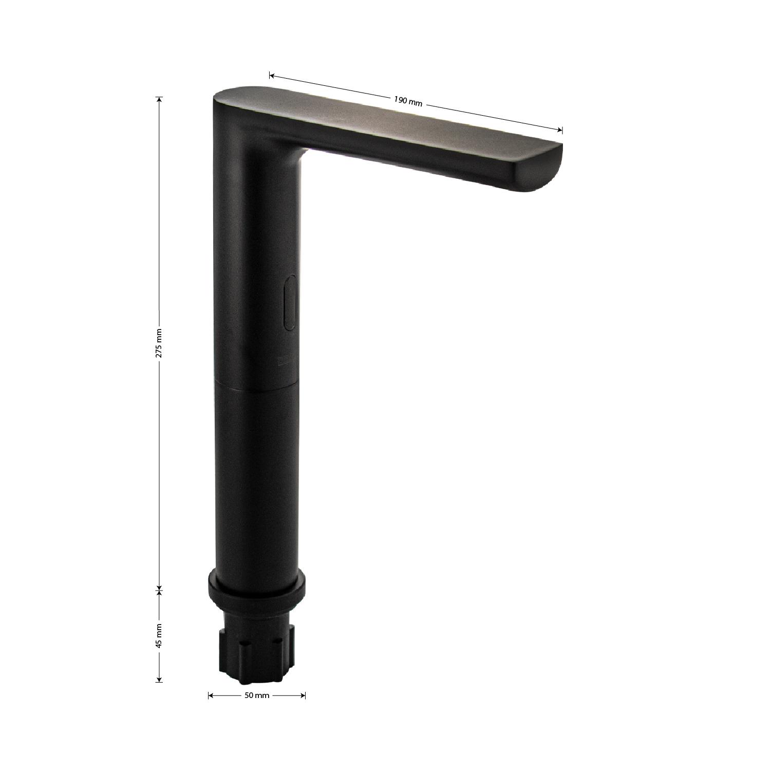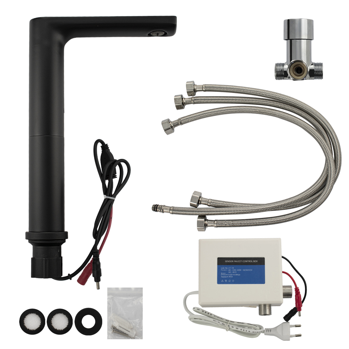 Сенсорный смеситель на раковину предназначен для монтажа в жилых домах и общественных помещениях. С возможностью подключения к сети и работы от батареек. Изделие выполнено в стиле хай-тек из высококачественного материала – нержавеющая сталь, черный цвет обеспечивает устойчивость к механическим воздействиям. Кран смешивания горячей и холодной воды с возможностью регулировки размещается под столешницей. Кран включится, если поднести руки к изливу. Бесконтактный принцип работы гарантирует гигиеничность устройства. Устройство снабжено аэратором, позволяющей очистку без использования дополнительных средств. Он насыщает воду воздухом для создания струи, комфортной для гигиенических процедур, и сокращения расхода ценного ресурса. Сенсорный смеситель включает поток воды за счет фотоэлемента. Габаритные размеры: высота 275 мм, длина 190 мм, диаметр посадочного седла 50 мм, длина резьбы 45 мм. Вес – 2,19 кг, объём – 0,00828 м3. В комплекте паспорт, корпус, нижняя часть с программным управлением, крепёж.