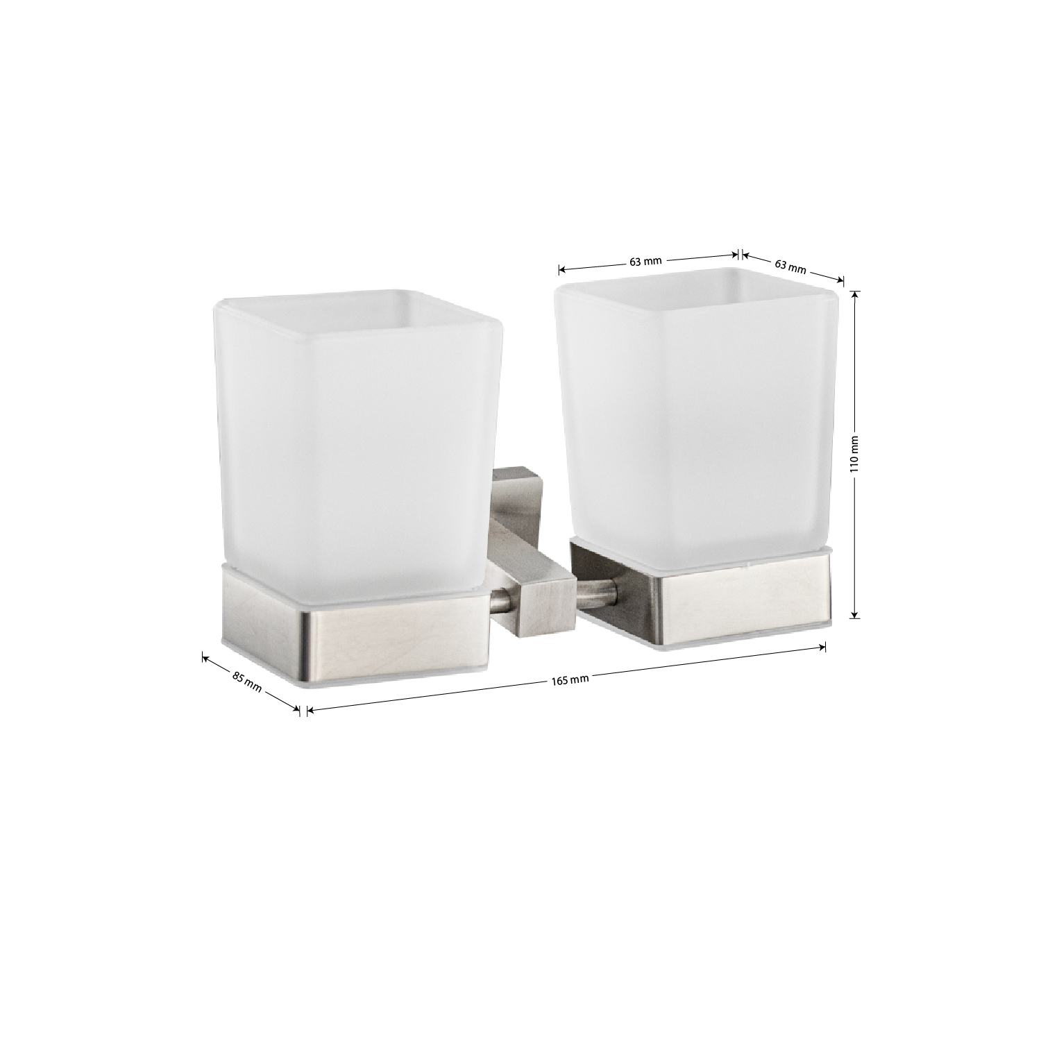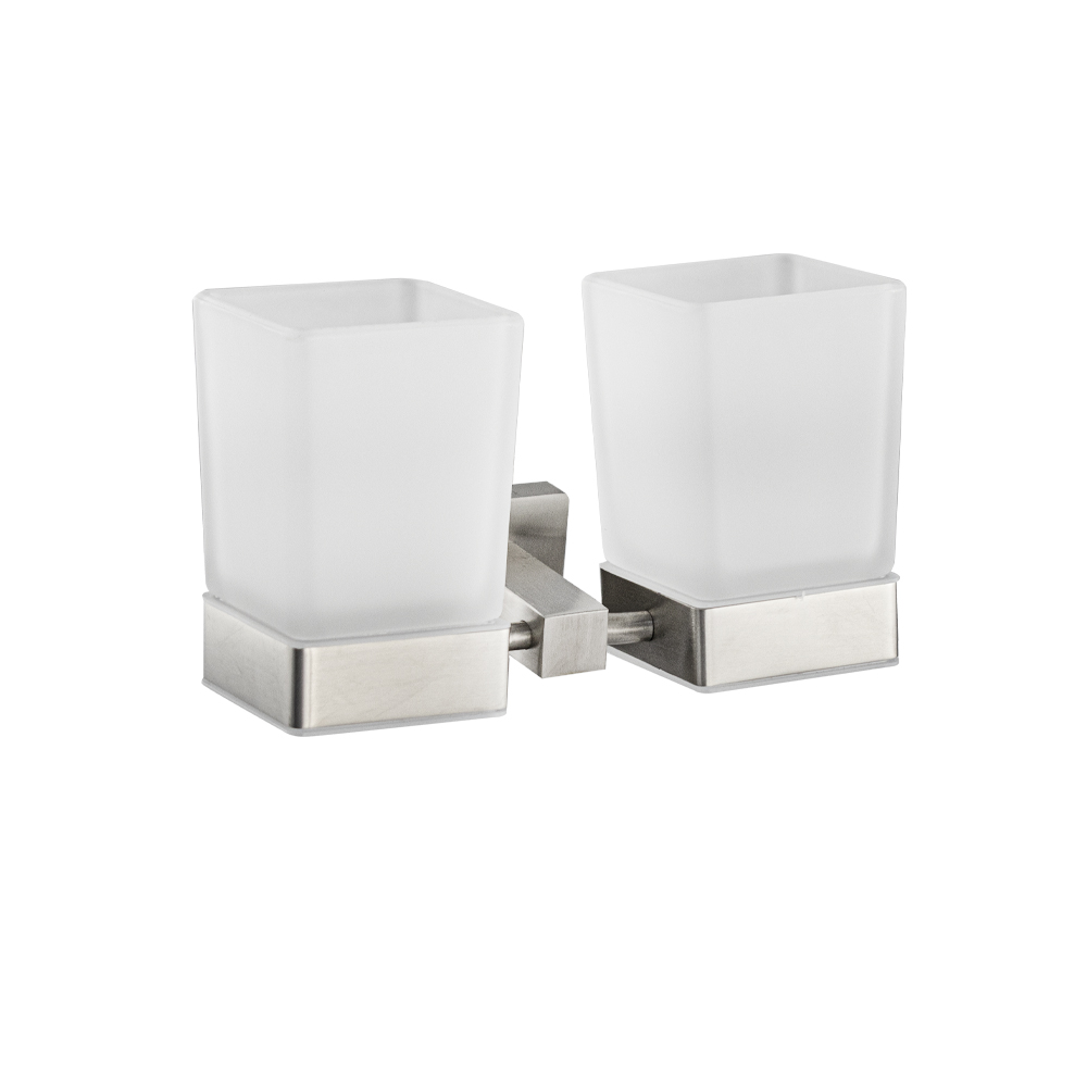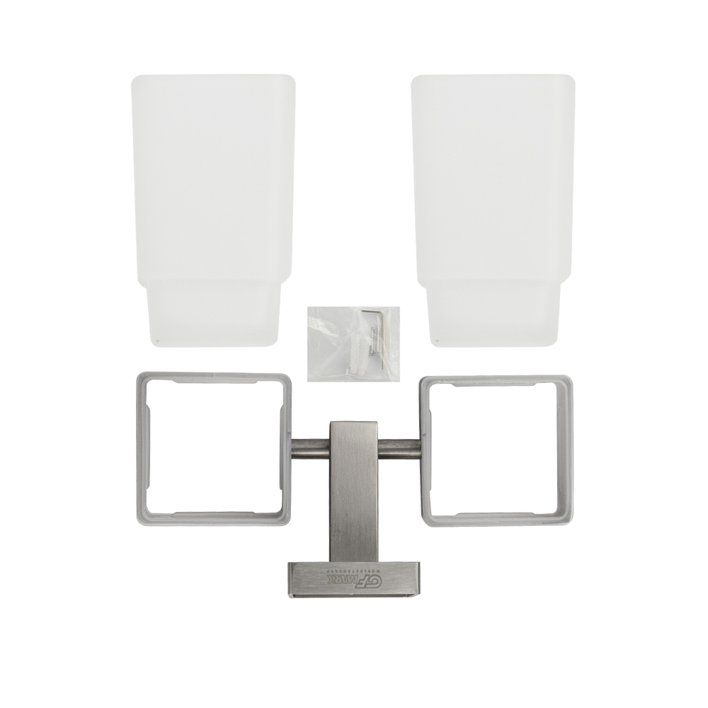 Стакан + стакан стеклянный с креплением к стене, квадратной формы на основании. Изделие выполнено из матового стекла и металла с матовым покрытием. Изготовлен из прочной нержавеющей стали марки SUS 304 с матовым покрытием, которое придает безупречный стильный вид и долговечность. Идеально подойдет не только для ванной, но и для кухни. Изделие крепится к стене с помощью дюбелей и саморезов (входят в комплект). Габаритные размеры: высота стакана 110 мм, ширина 165 мм, глубина 85 мм, основание 50*50 мм.