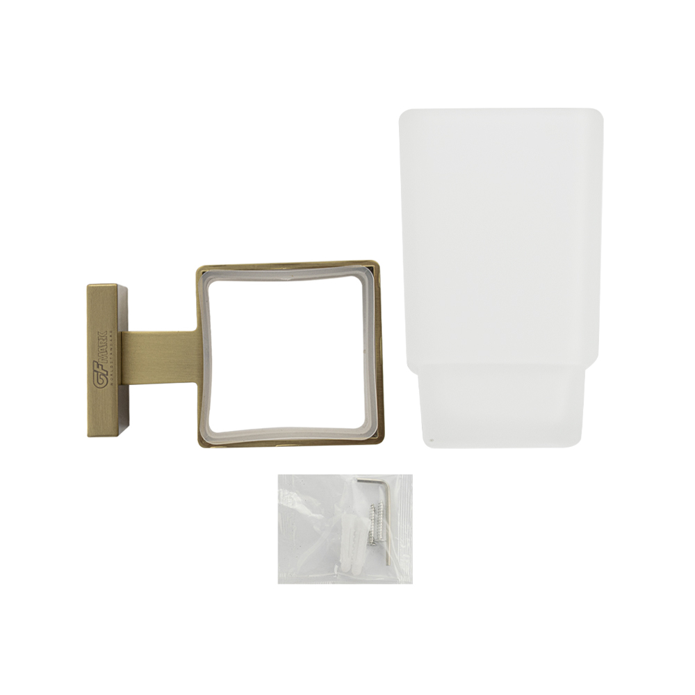 Стакан стеклянный с креплением к стене, квадратной формы на основании. Изделие выполнено из матового стекла и металла с матовым покрытием Изготовлен из прочной нержавеющей стали марки SUS 304 с матовым золотым покрытием, которое придает безупречный стильный вид и долговечность. Идеально подойдет не только для ванной, но и для кухни. Изделие крепится к стене с помощью дюбелей и саморезов (входят в комплект). Габаритные размеры: высота стакана 100 мм, диаметр 63*63 мм, ширина 95 мм, основание 50*50 мм