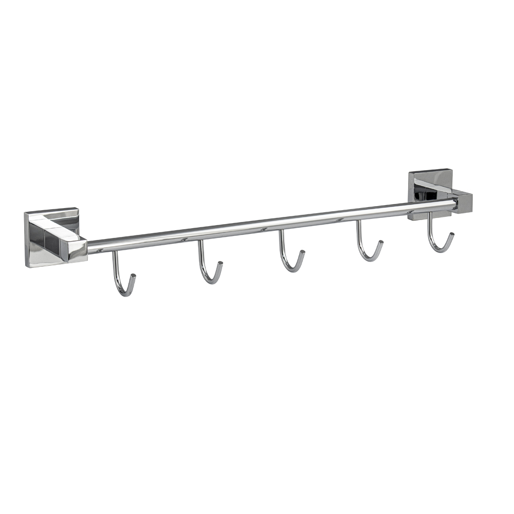 Держатель для полотенец металлический, хромированный с пятью крючками. Материал изготовления — ЦАМ (цинк-алюминий-медь) + нержавеющая сталь. Хромированное покрытие очень стойко переносит истирания и обеспечивает зеркальный блеск изделия. На держателе с легкостью можно размещать вещи для сушки или вешать, как полотенца, так и одежду перед походом в душ. Идеально подойдет не только для ванной, но и для кухни, а также для дачи или гаража – при необходимости на держатель можно вешать любые предметы. Изделие крепится к стене с помощью дюбелей и саморезов (входят в комплект). Габаритные размеры: длина мм, глубина мм, высота мм. Вес – кг, объём – м3.