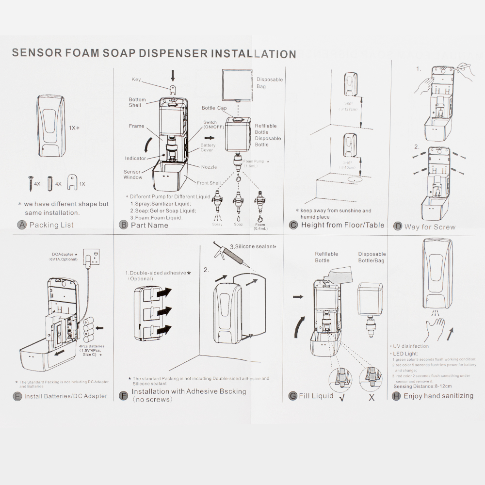 Настенный, автоматический сенсорный дозатор, предназначен для бесконтактной обработки рук жидким мылом, предназначен для установки в любых санитарно-гигиенических комнатах. Имеет ключ и пластиковый замок. Дозатор прост в эксплуатации, достаточно поднести ладонь к сенсору для получения порции средства. Автоматическая подача – предотвращает распространение микробов, вызванных прикосновением. Для удобства контроля за уровнем мыла на лицевой поверхности есть смотровое окно. Корпус диспенсера изготовлен из прочного пластика АБС белого цвета, который выдерживает различные механические воздействия. В резервуар емкостью 1000 мл можно заливать как жидкое мыло, так и прочие средства. Разместив диспенсер на стене, достаточно время от времени проверять заполненность резервуара. Это отличное решение как для частных владений, так и для гостиниц, кафе, столовых и прочих общественных мест. Питание от 4-х батареек АА (в комплект не входят). Габаритные размеры: высота 260 мм, ширина 120 мм, глубина 105 мм. Вес – 0,900 кг, объем – 0,00466 м3.