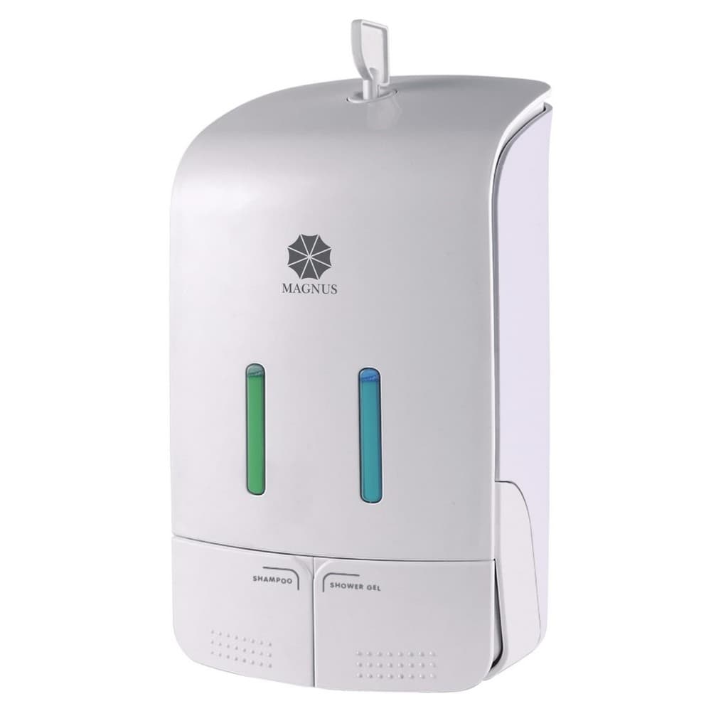 Двойной дозатор для жидкого мыла из ударопрочного пластика. Объем: 2х550 мл. Закрытие на ключ