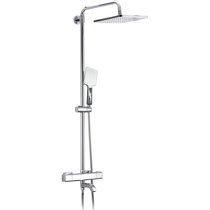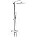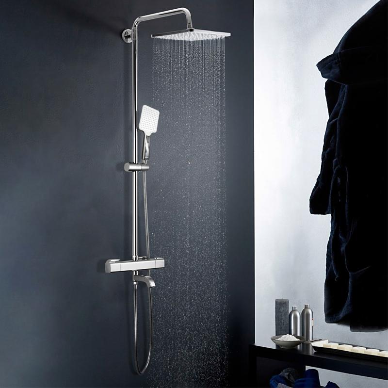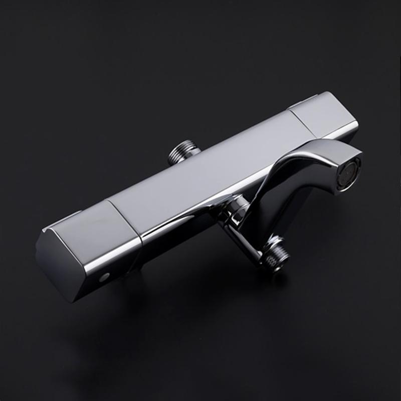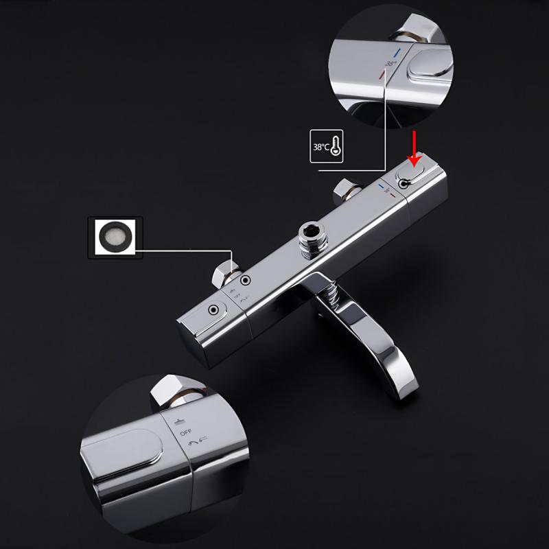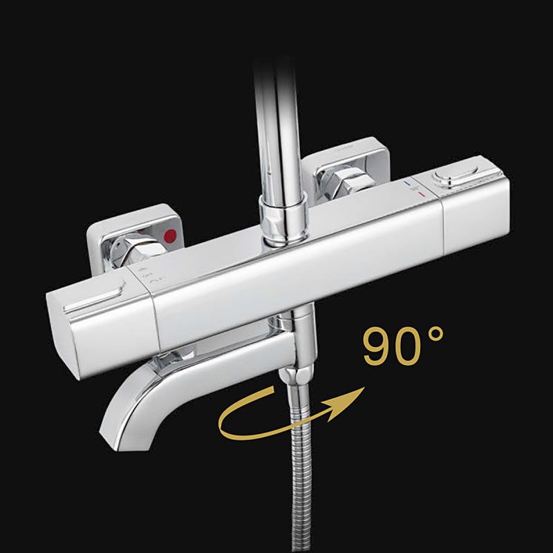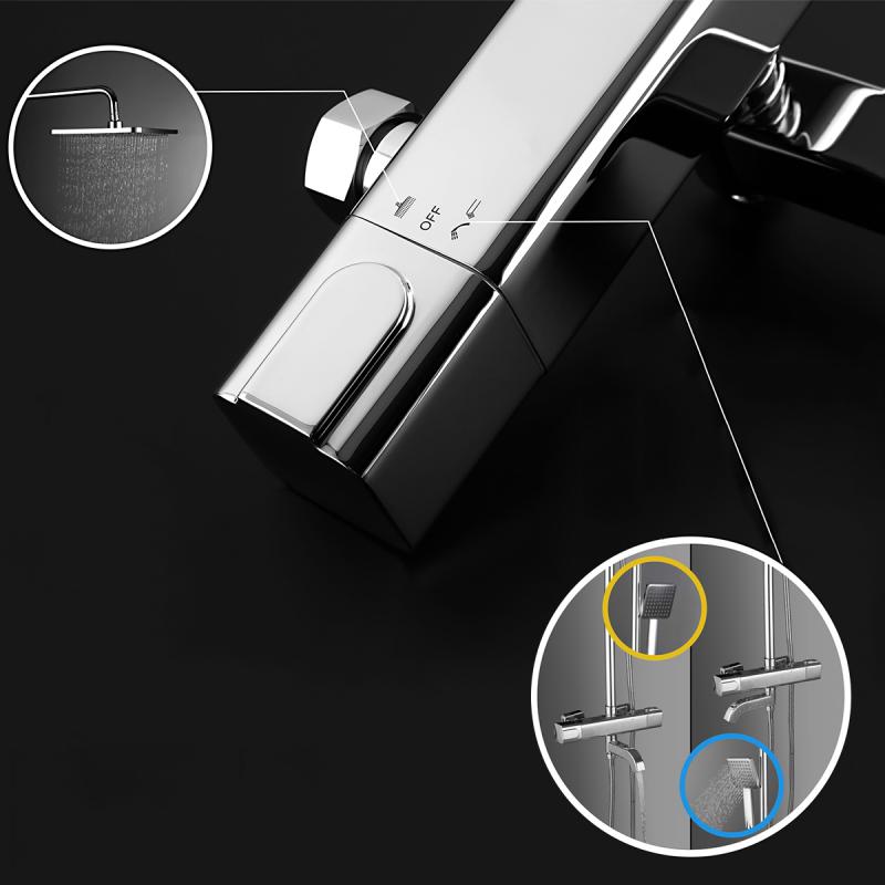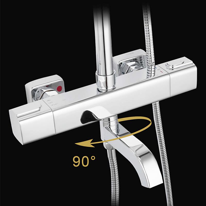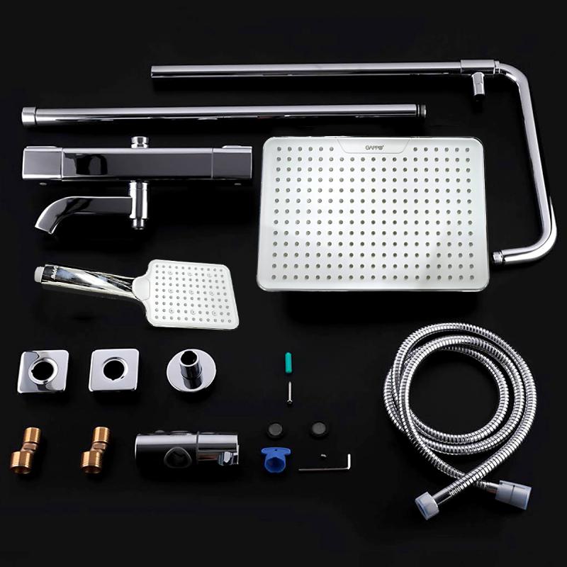 Gappo G2491 – душевая система хромированного цвета монтируется на стену, имеет термостатический смеситель для безопасного использования в домах с перепадами температур. Изготавливается корпус смесителя только из качественной латуни в комплектации с термостатическим картриджем. Верхний тропический душ выполнен из ABS-пластика, а шланг душа изготовлен в металлической оплетке. На обоих лейках душевой системы предусмотрены силиконовые форсунки, они помогают легко удалять известковые отложения в выпускных отверстиях для воды.