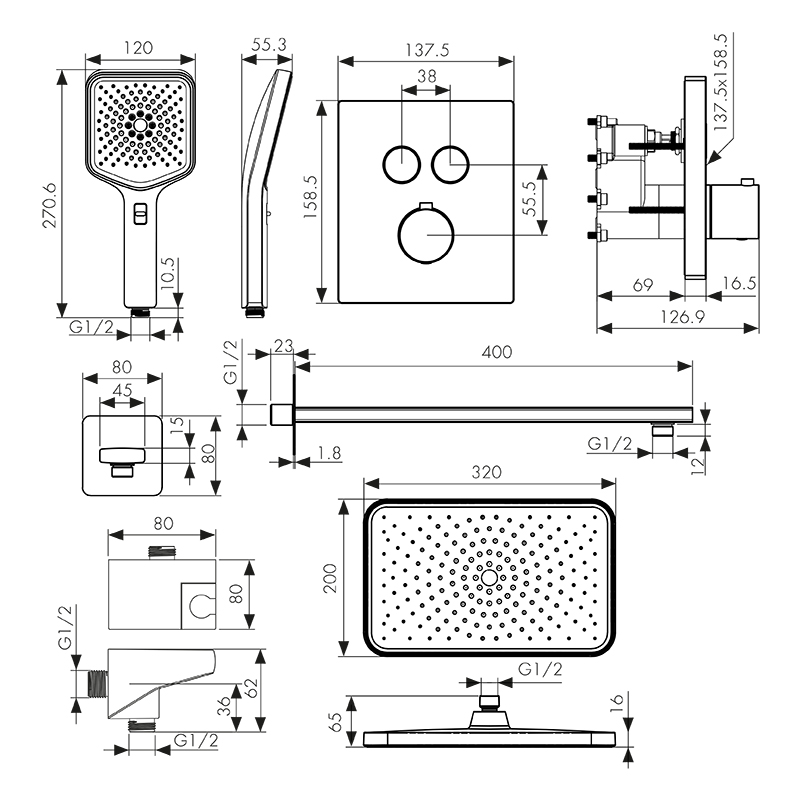 смеситель скрытого монтажа, скрытая монтажная часть, кронштейн, лейки, настенное соединение шланга с поворотным держателем, шланг, крепления |