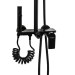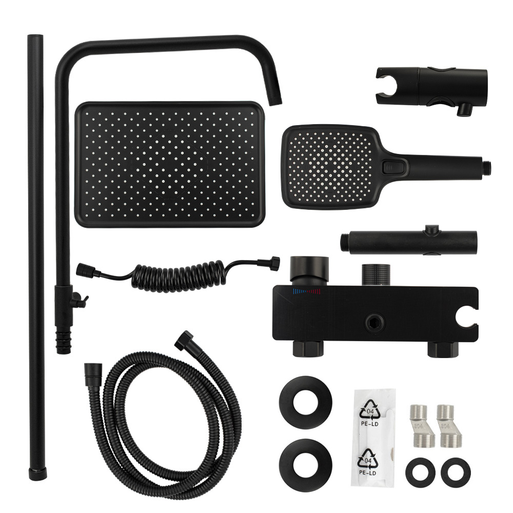 Смеситель + стойка душевая “тропический душ” с двумя лейками и гигиеническим душем, черные. В дизайне душевой стойки гармонично соединились строгие линии и мягкие переходы. Она отлично впишется в интерьер ванной комнаты в минималистическом стиле. Черное  покрытие не стирается и сохраняет первозданный внешний вид в течение всего периода эксплуатации. Длительную работу без протечек обеспечивает смеситель с керамическим картриджем. Угол наклона верхнего душа можно регулировать в соответствии с потребностями каждого пользователя. Ручная лейка оснащена металлическим шлангом, который не перекручивается во время водных процедур. Смеситель с душевым шлангом и лейкой и дивертор переключения в трёх положениях. Картридж d =  мм, ручка с кольцом, аэратор для экономии воды, чашки и эксцентрики. Душевая стойка с присоединением к корпусу смесителя и дополнительным креплением к стене и большой прямоугольной лейкой с эффектом тропического душа. Габаритные размеры: ширина смесителя 150 мм, высота 100 мм, длина излива корпуса 110 мм, высота стойки 800-1120 мм, длина излива стойки 350 мм, душевая лейка 110*255 мм, лейка тропический душ 300*200 мм, шланг 150 см. Вес –  кг, объём –  м3. В комплекте корпус с изливом, чашки, эксцентрики, прокладки, стойка, дивертор, шланг, две лейки, крепления.