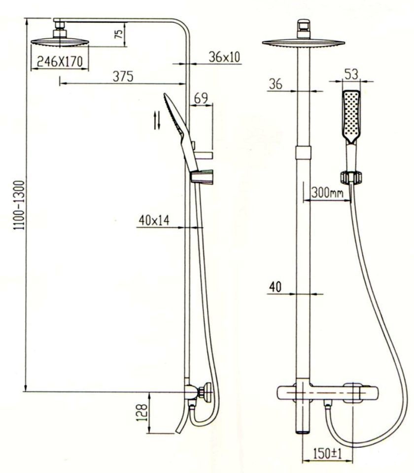 смеситель, релинг, верхний душ, душевая лейка, держатель лейки, шланг, крепления |