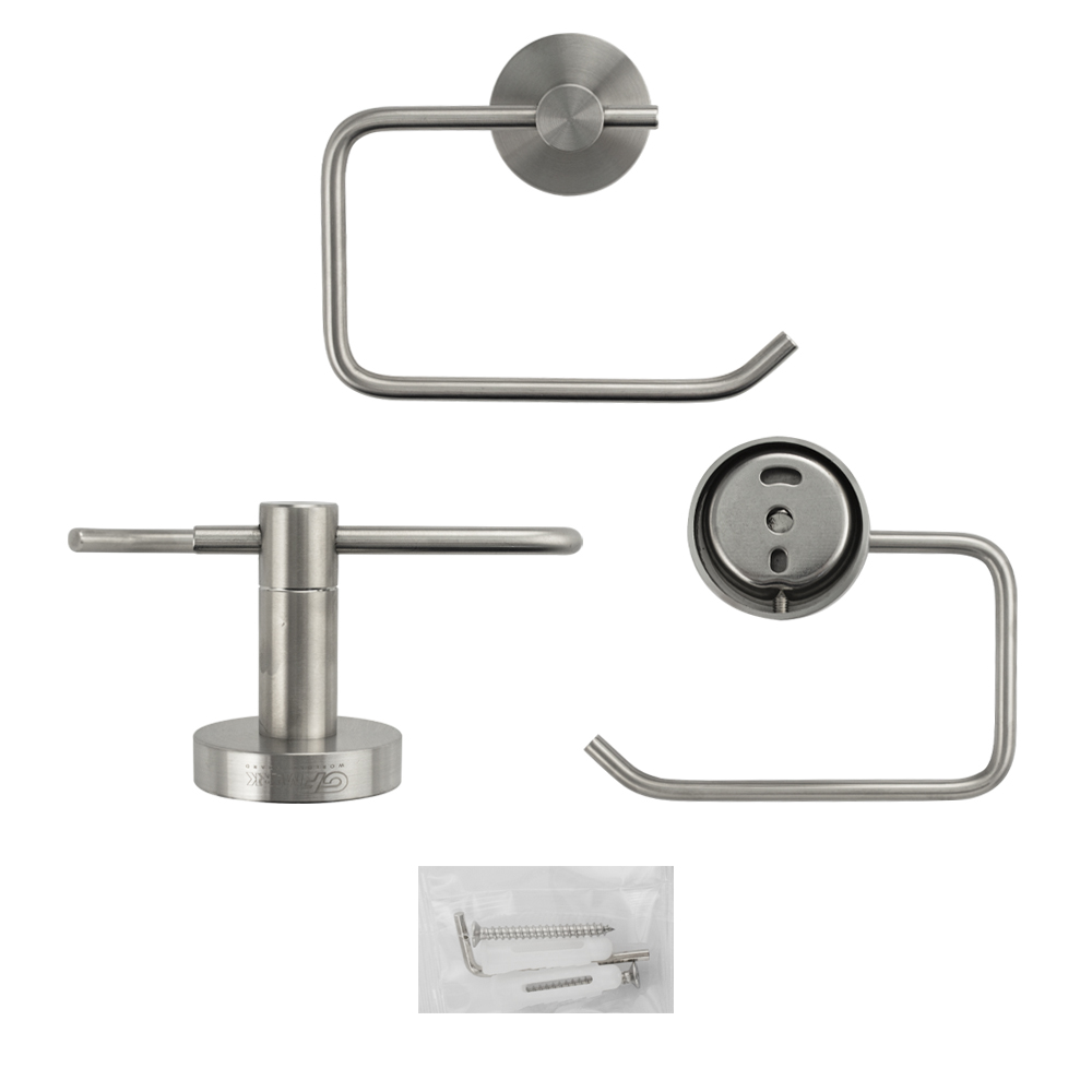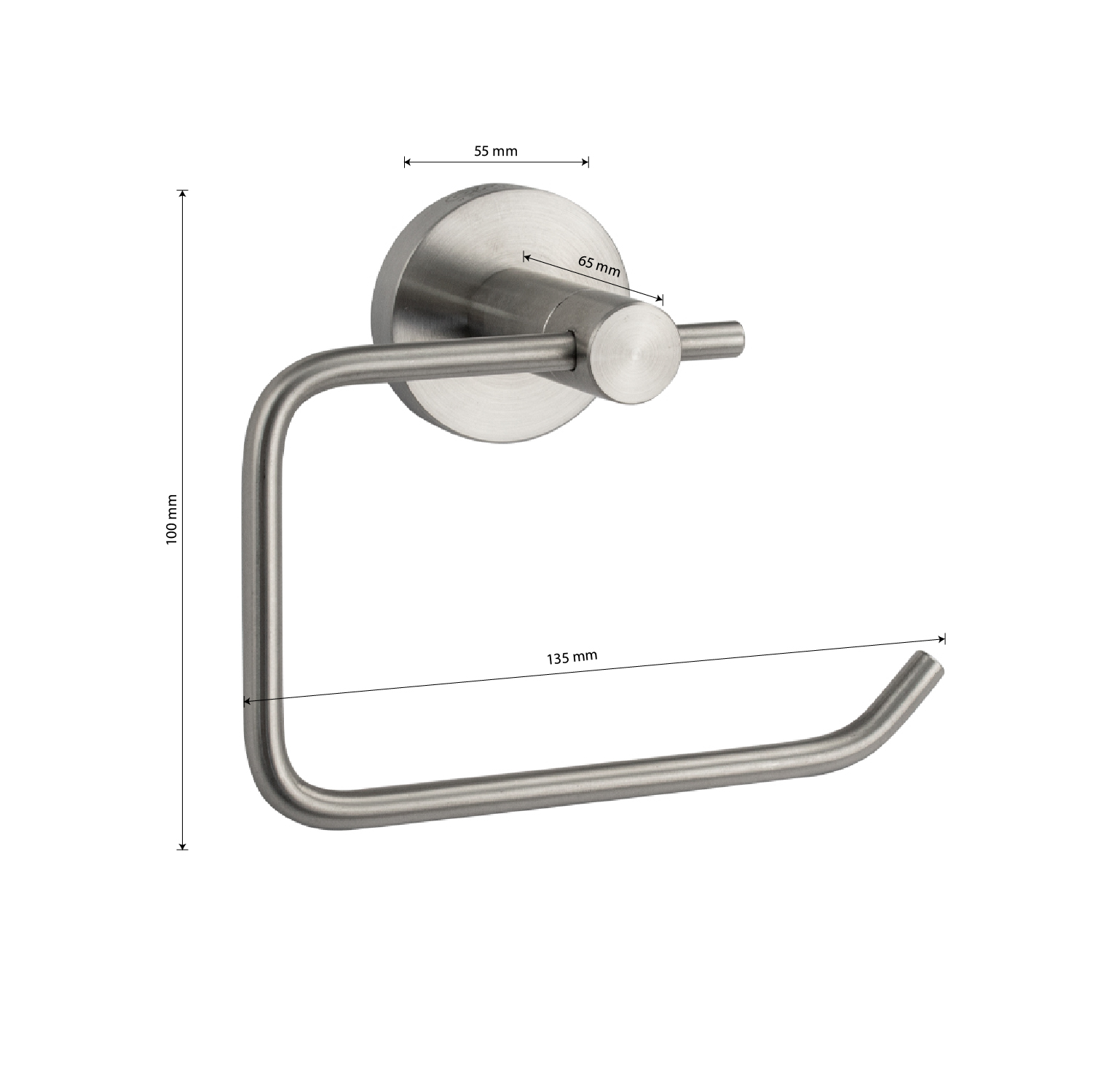 Бумагодержатель без крышки, металлический, стильный и функциональный элемент санузла. Изготовлен из прочной нержавеющей стали марки SUS 304 с матовым покрытием, которое придает безупречный стильный вид и долговечность. Держатель для туалетной бумаги легко и удобно крепится к стене при помощи фурнитуры входящей в комплект поставки. Удобно чистить и легко менять рулоны. Габаритные размеры: ширина 135 мм, высота 100 мм, глубина 65 мм, основание 55 мм.