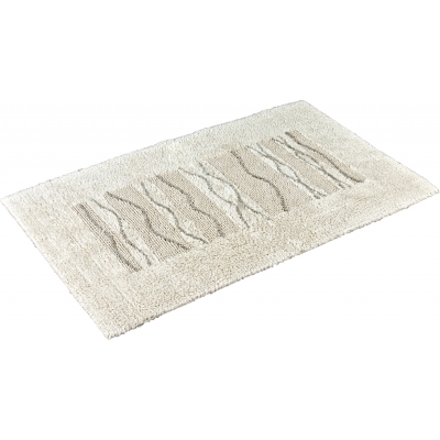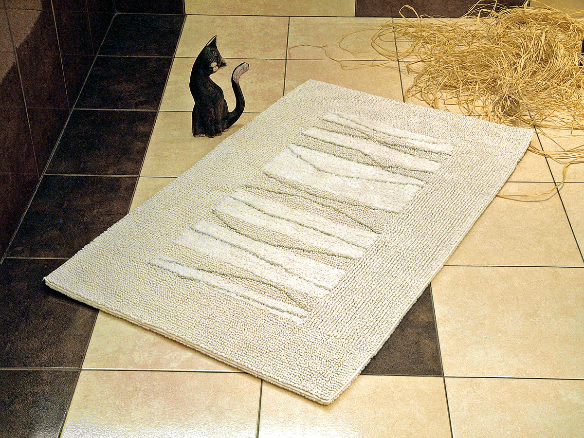 Коврик для ванной комнаты. Материал – 100% хлопок. Цвет кремовый. Двухсторонний рисунок. Основные преимущества – практичность, долговечность, простота ухода, экологичность. Качество материала позволяет на протяжении длительного времени сохранять первоначальную форму, цвет и высоту ворса коврика. Для сохранения мягкости нитей ткани рекомендуется ручная или машинная стирка с добавлением смягчающих средств. С целью избежания деформации коврик следует сушить на плоской поверхности. Может использоваться не только в ванной комнате, но и в других помещениях. Допустимо размещение на подогреваемых полах.