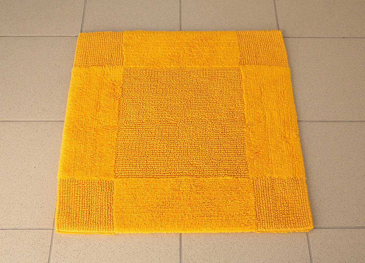 Коврик для ванной комнаты. Материал – 100% хлопок. Цвет желтый. Двухсторонний рисунок. Основные преимущества – практичность, долговечность, простота ухода, экологичность. Качество материала позволяет на протяжении длительного времени сохранять первоначальную форму, цвет и высоту ворса коврика. Для сохранения мягкости нитей ткани рекомендуется ручная или машинная стирка с добавлением смягчающих средств. С целью избежания деформации коврик следует сушить на плоской поверхности. Может использоваться не только в ванной комнате, но и в других помещениях. Допустимо размещение на подогреваемых полах.