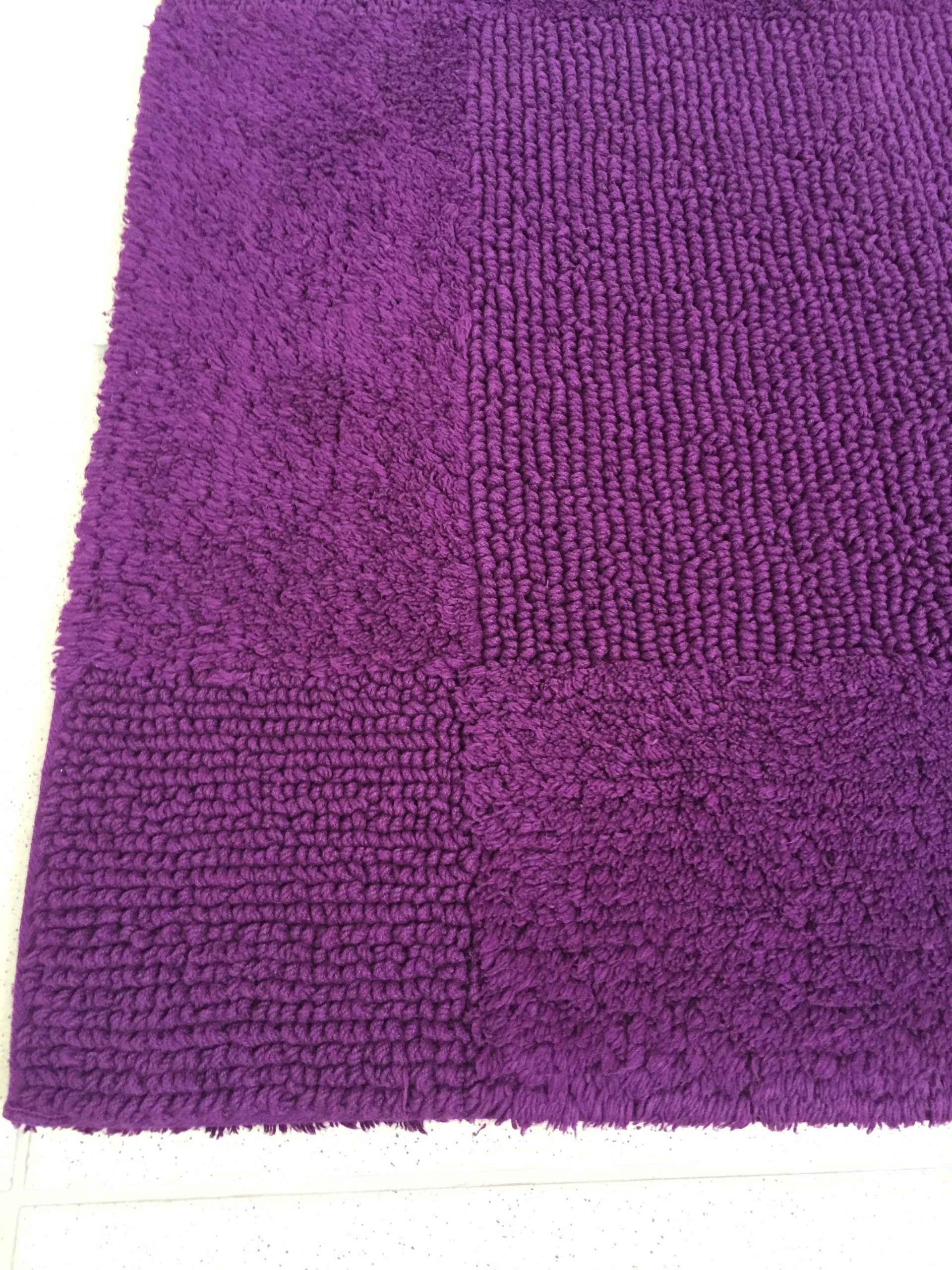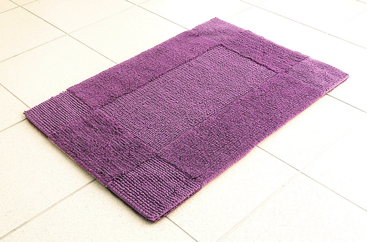 Коврик для ванной комнаты. Материал – 100% хлопок. Цвет фиолетовый. Двухсторонний рисунок. Основные преимущества – практичность, долговечность, простота ухода, экологичность. Качество материала позволяет на протяжении длительного времени сохранять первоначальную форму, цвет и высоту ворса коврика. Для сохранения мягкости нитей ткани рекомендуется ручная или машинная стирка с добавлением смягчающих средств. С целью избежания деформации коврик следует сушить на плоской поверхности. Может использоваться не только в ванной комнате, но и в других помещениях. Допустимо размещение на подогреваемых полах.