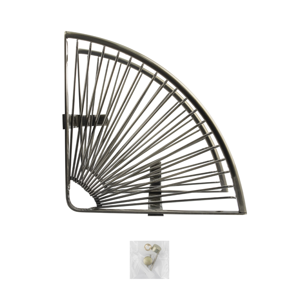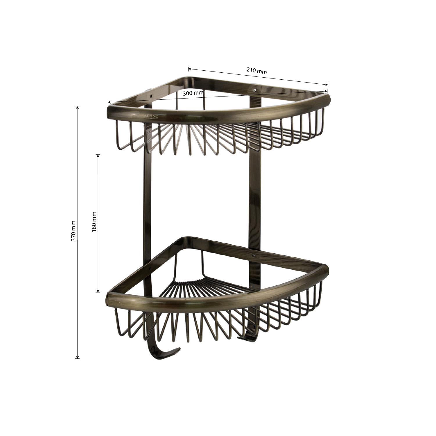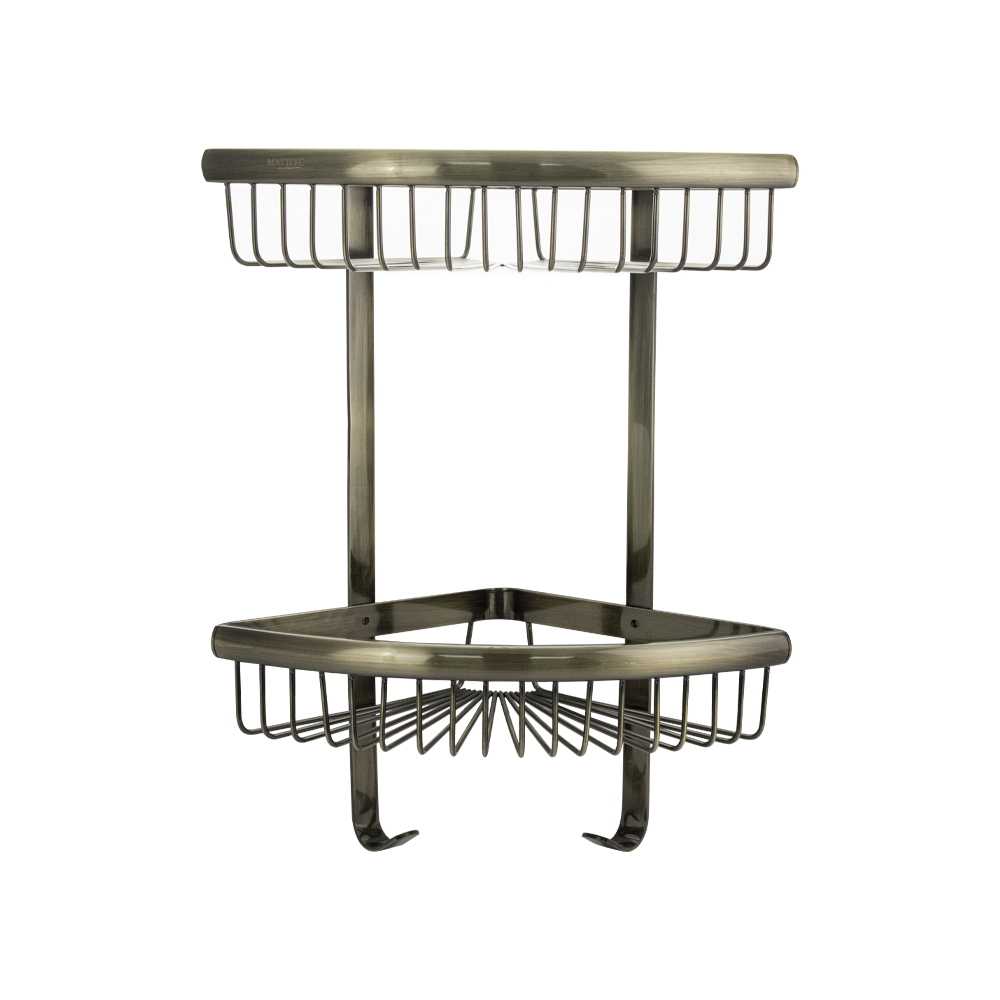 Полочка угловая, овальная, двухэтажная, для принадлежностей, решётка обладает высокими эксплуатационными характеристиками и подходит для использования дома, в общественных местах: отелях, ресторанах и пр. Изготовлена из прочной нержавеющей стали с бронзовым покрытием, которое придает безупречный стильный вид и долговечность. Металлическая полка оснащена крючками. Аксессуар не занимает много места, надежно фиксируется к стене при помощи набора креплений (входят в комплект) и служит удобным местом для хранения бытовых и косметических средств. Габаритные размеры: высота 370 мм, ширина 300 мм, длина стороны 210 мм, расстояние между полками 180 мм.