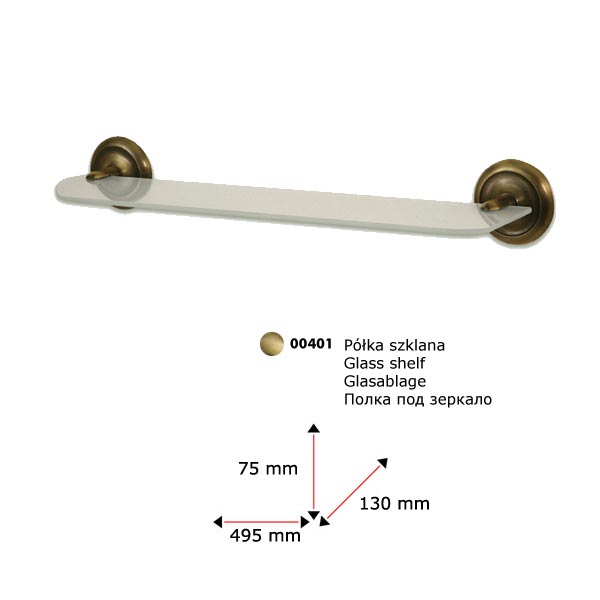 Полка под зеркало. Крепится к стене шурупами. Произведено из цинкоалюминиевого сплава с покрытием цвета античной латуни, и матового стекла.