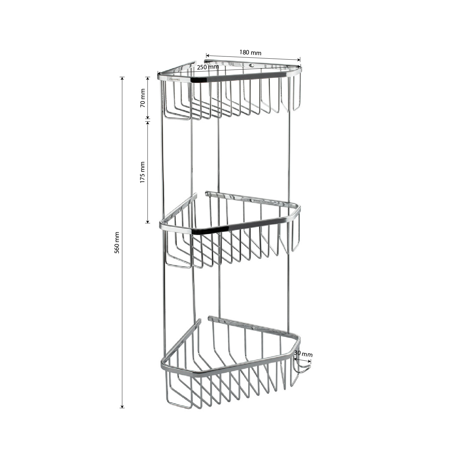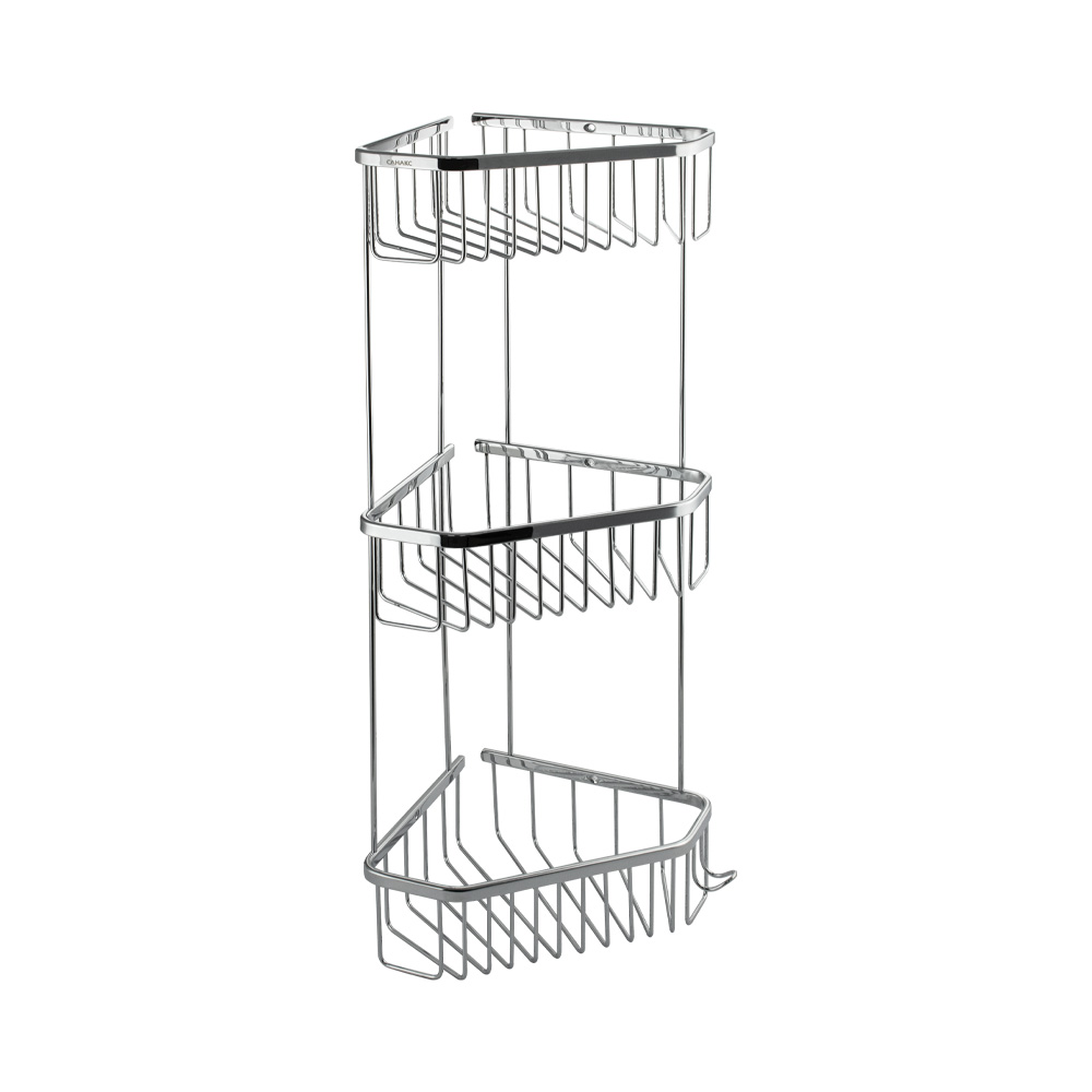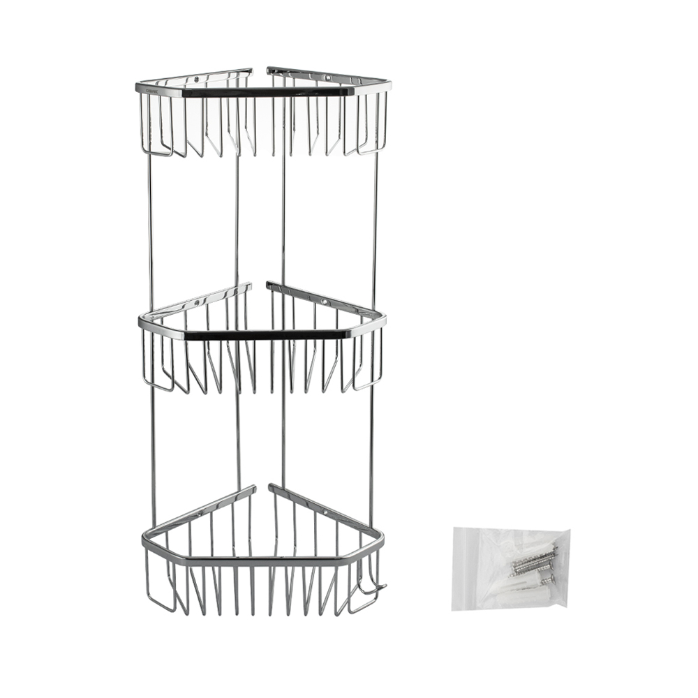 Полочка угловая, пятиугольная, трёхэтажная, для принадлежностей, решётка обладает высокими эксплуатационными характеристиками и подходит для использования дома, в общественных местах: отелях, ресторанах и пр. Изготовлена из прочной нержавеющей стали с хромоникелевым покрытием, которое придает безупречный глянцевый блеск и долговечность. Металлическая полка оснащена крючкоми. Аксессуар не занимает много места, надежно фиксируется к стене при помощи набора креплений (входят в комплект) и служит удобным местом для хранения бытовых и косметических средств. Габаритные размеры: высота 560 мм, ширина 250 мм, глубина 180 мм, расстояние между полками 175 мм.