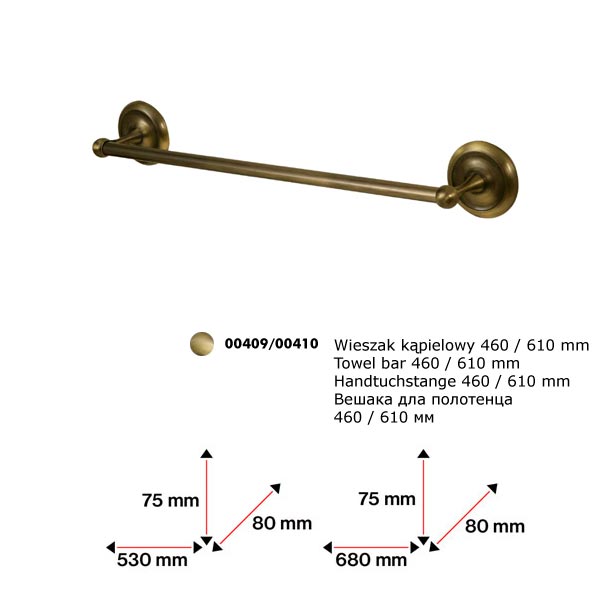 Вешалка для полотенец 610 мм. Крепится к стене шурупами. Произведено из цинкоалюминиевого сплава с покрытием цвета античной латуни.