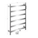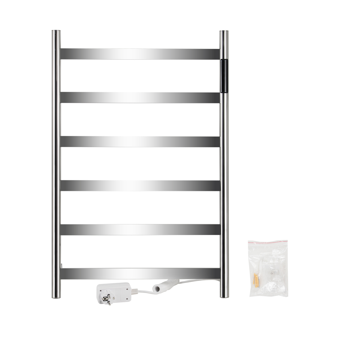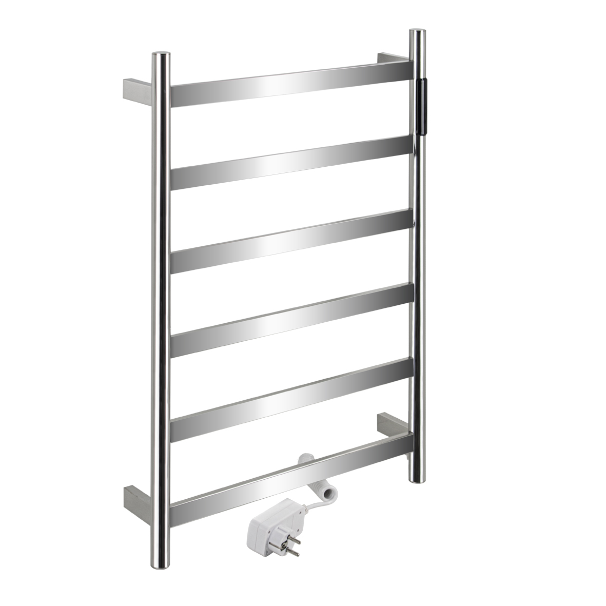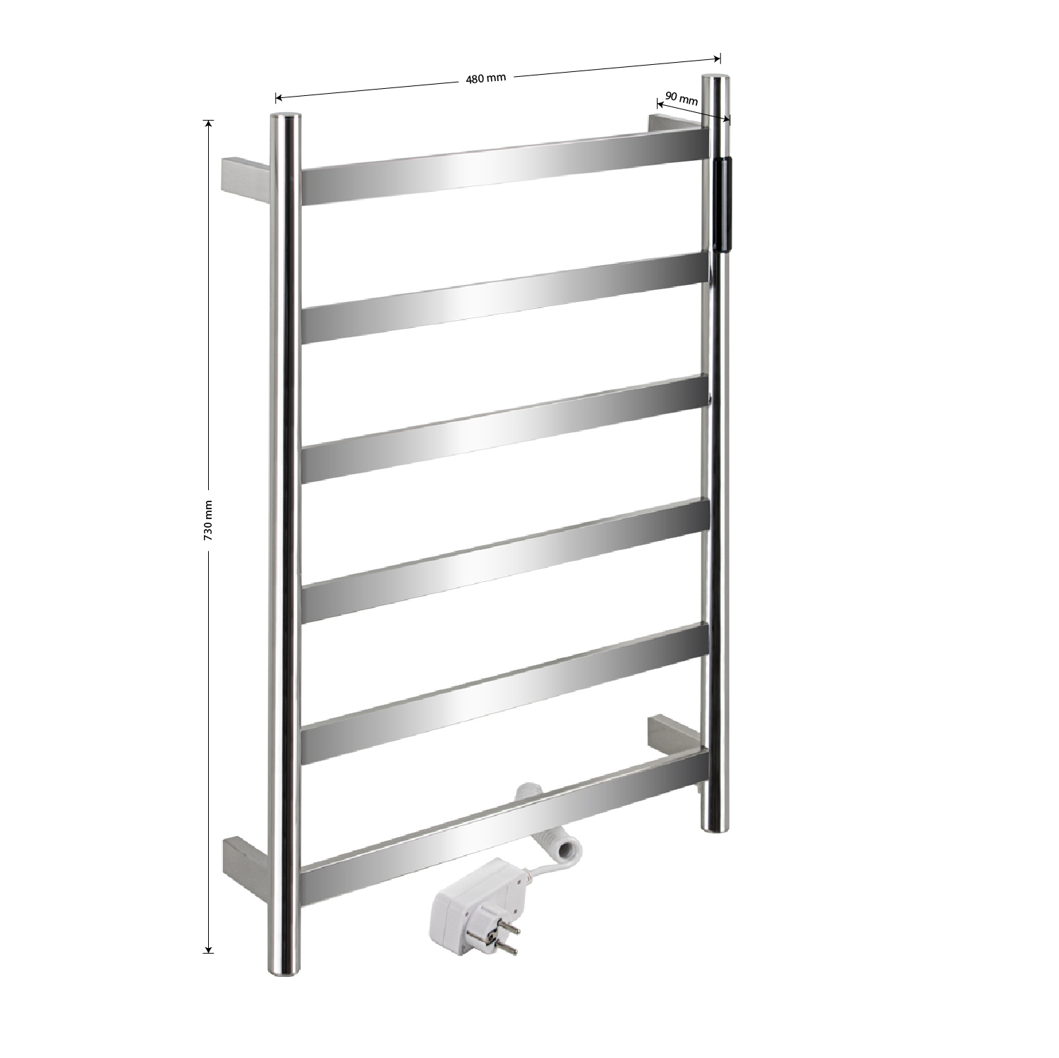 Полотенцесушитель электрический хромированный, лесенка из нержавеющей стали марки 304, с таймером до 24 часов, регулировка температуры от 35°С до 70°С, тэн из углеродного волокна, гармонично впишется в современный интерьер и поможет поддержать комфортную атмосферу в ванной комнате, работает вне зависимости от отопительного сезона, и его можно разместить в любом месте ванной или даже на стене в комнате. Хромированная поверхность устойчива к высоким температурам. Благодаря продуманному расположению труб можно размещать объемный текстиль, сократив время просушки. Установка и ремонт не требуют работы сантехников. Габариты и параметры: ширина 480 мм, высота 730 мм, глубина 90 мм. 6 перекладин, с сухим ТЭНом, 75 W, 220-230 V, 50-60 Гц, t – 55°С, IP 44. Комплект: полотенцесушитель, крепёж, провод с евровилкой для подключения.