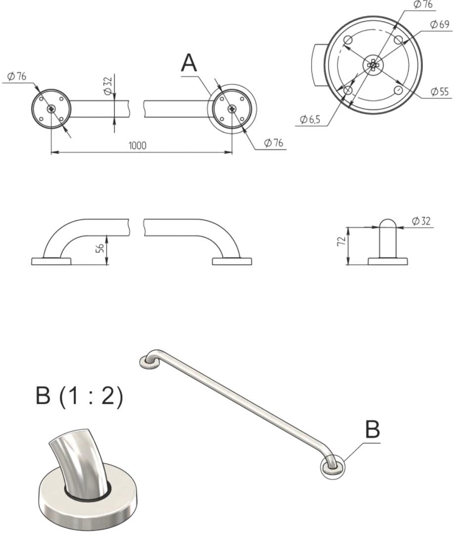 Поручень настенный прямой, L=1000 мм, Ø32 мм, AISI 304, GRIT 600 в продаже. Оперативная доставка со склада в Минске. Все товары соответствуют стандартам качества.