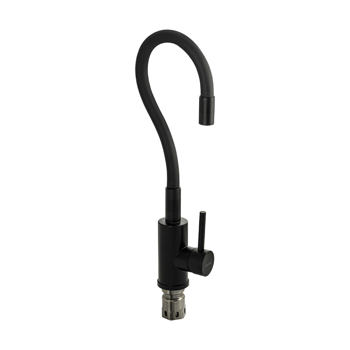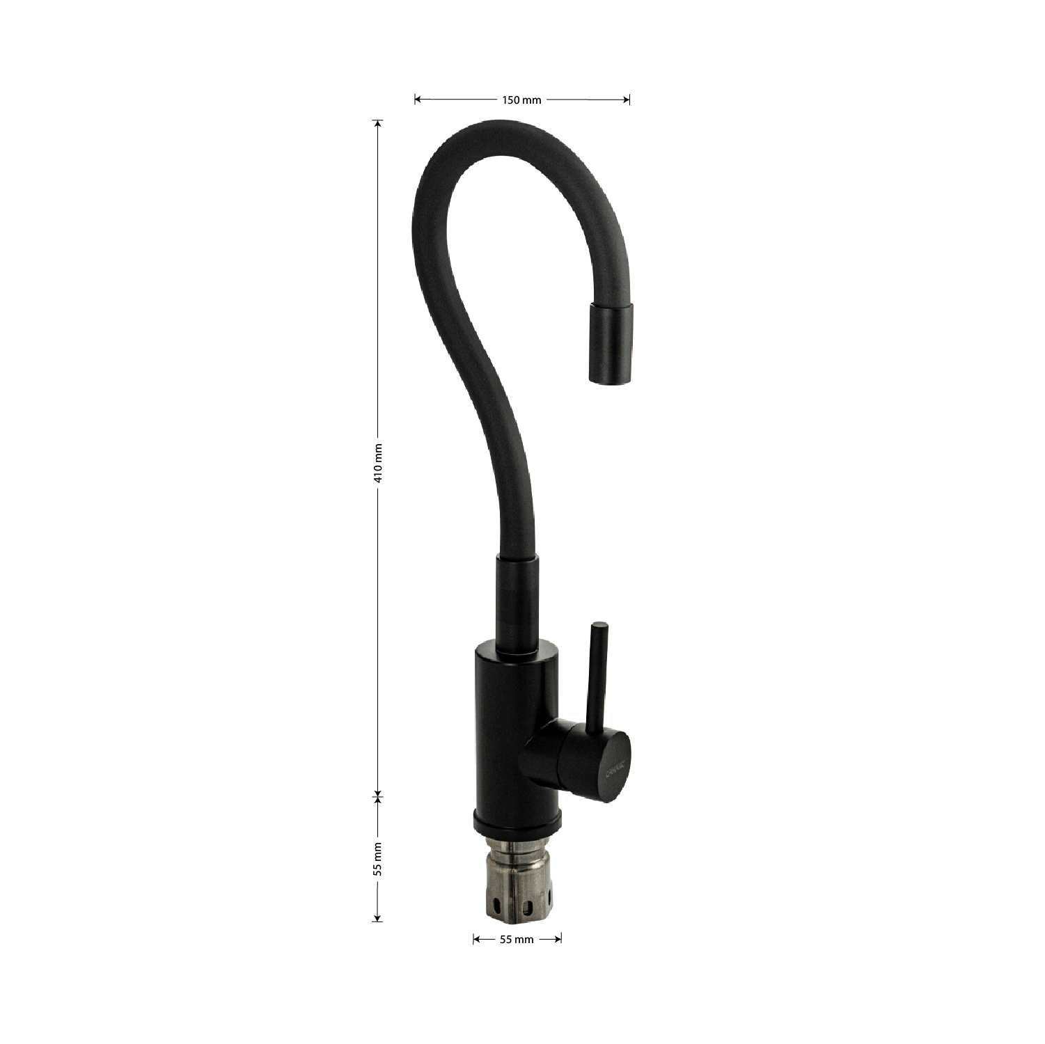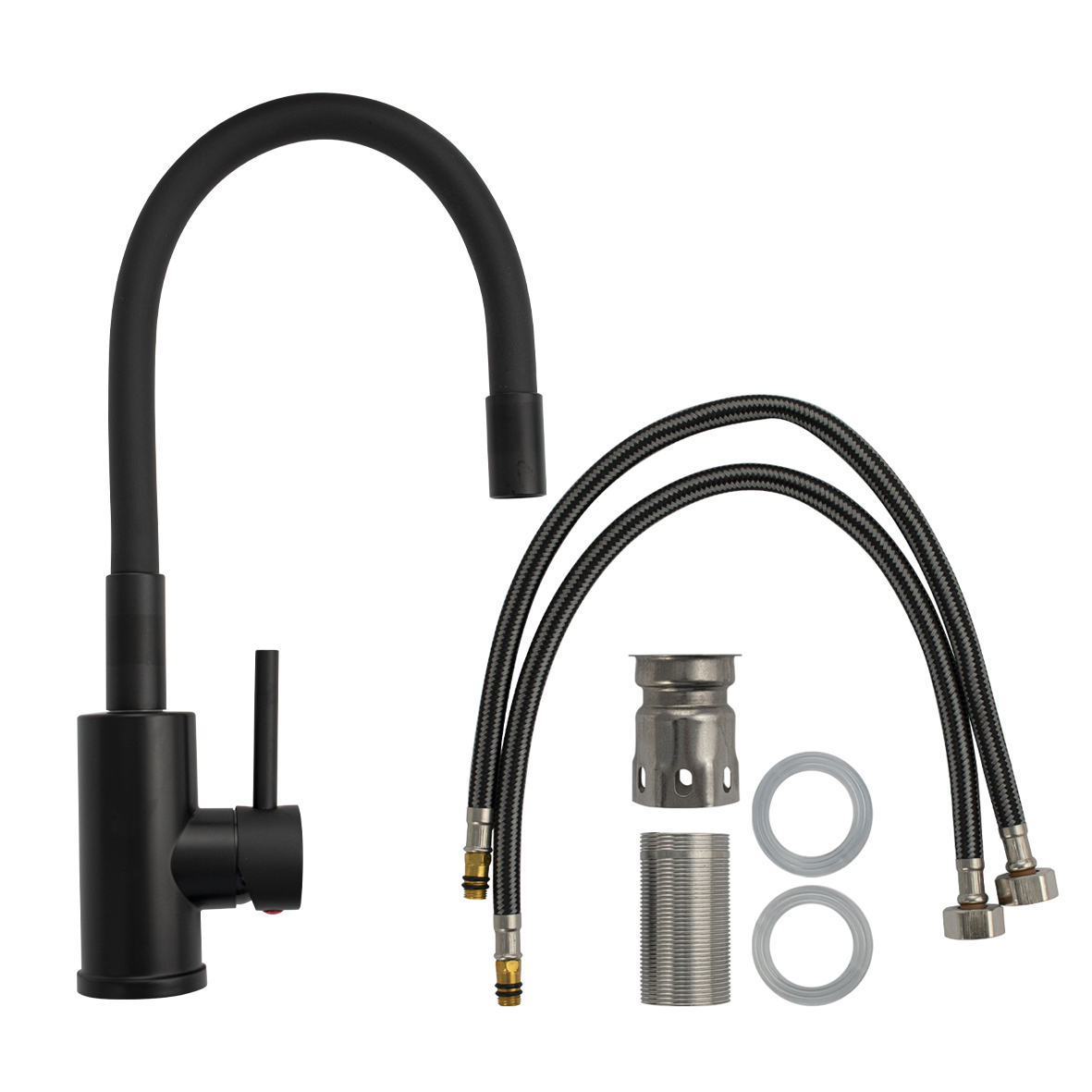 Смеситель для кухонной мойки и раковин, литой черный матовый корпус, из нержавеющей стали марки 304, с высоким гибким изливом, чёрного цвета, с аэратором для экономии воды, шаровый. Крепление резьба – гайка, картридж d = мм, ручка литая. Такая модель может использоваться на домашней кухне, на даче, в медицинских учреждениях и общественных местах. Габаритные размеры: высота до 410 мм, длина до 200 мм, диаметр посадочного седла 55 мм, длина резьбы 55 мм, длина подводки 500 мм. Вес – 1.27 кг, объём – 0.00385 м3. В комплекте паспорт, корпус с изливом, подводка 1/2, крепеж, набор прокладок.