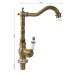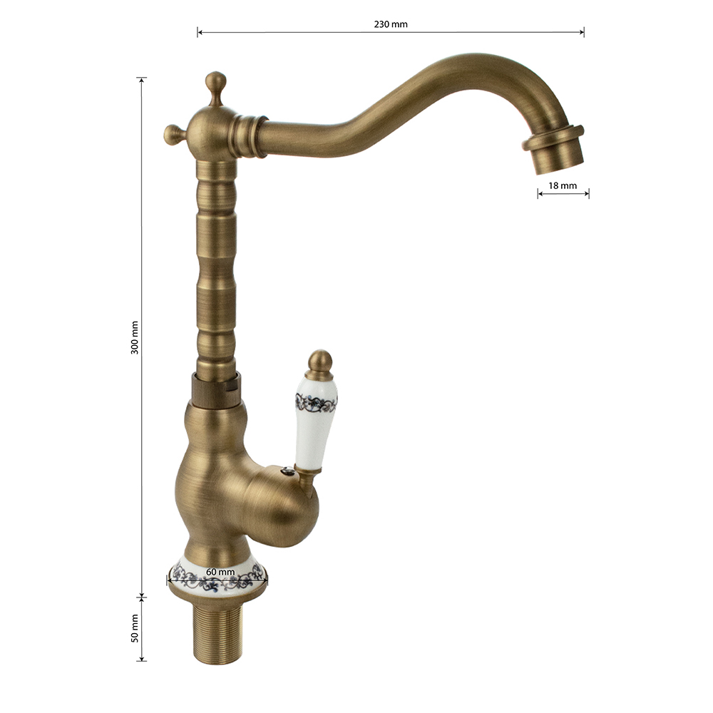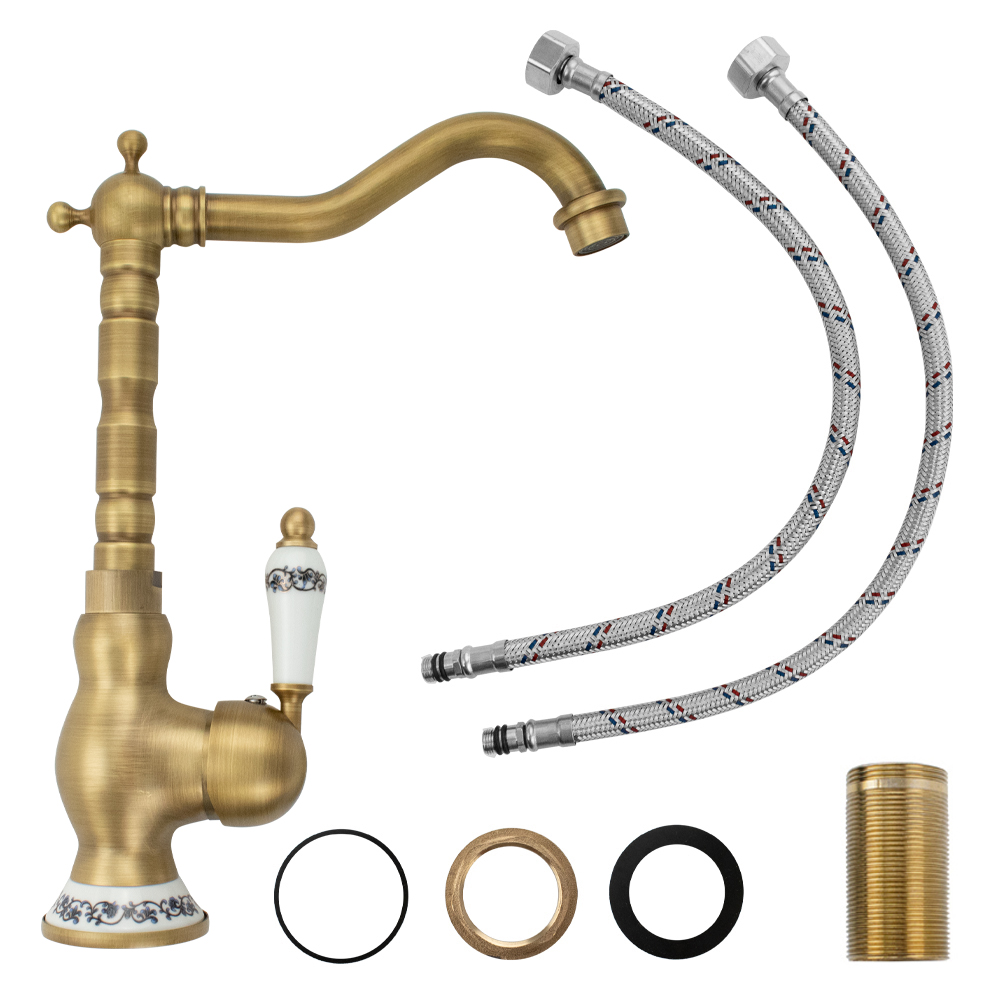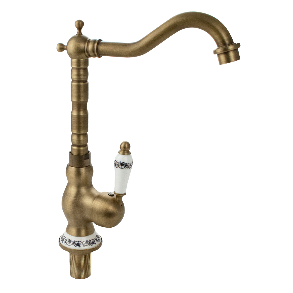 Смеситель для кухонной мойки и раковин, боковой, шаровый, корпус под состаренную бронзу с вставками белой керамики, с высоким Г-образным, поворотным вокруг оси изливом. Материал изготовления — латунь. Крепление резьба – гайка, картридж d = 40 мм, литая ручка. Аэратор для экономии воды. Габаритные размеры: высота 300 мм, длина 230 мм, диаметр посадочного седла 60 мм, длина резьбы 50 мм, длина подводки 400 мм. Вес – 1,250 кг, объём – 0,00680 м3. В комплекте паспорт, корпус с изливом, подводка 1/2, крепеж, набор прокладок
