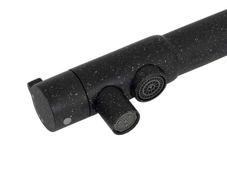 Смеситель 13044-12 из коллекции Teka совмещен с краном для питьевой воды. Особенность модели заключается в сдвоенном изливе, внутри которого проходят две трубки, для питьевой и проточной воды. Два аэратора для раздельного выхода проточной и фильтрованной воды, исключают возможность их смешивания. Подача питьевой воды осуществляется переключателем на конце излива. Преимущество совмещенных смесителей заключается в том, что не нужно делать дополнительных отверстий на мойке и устанавливать отдельный кран для питьевой воды.