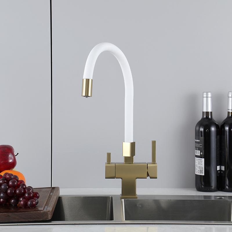 Смеситель для кухни с подключением питьевой воды Gappo G4395-33 (золотой), гибкий силиконовый излив, надежный латунный корпус, керамический картридж 35 мм.