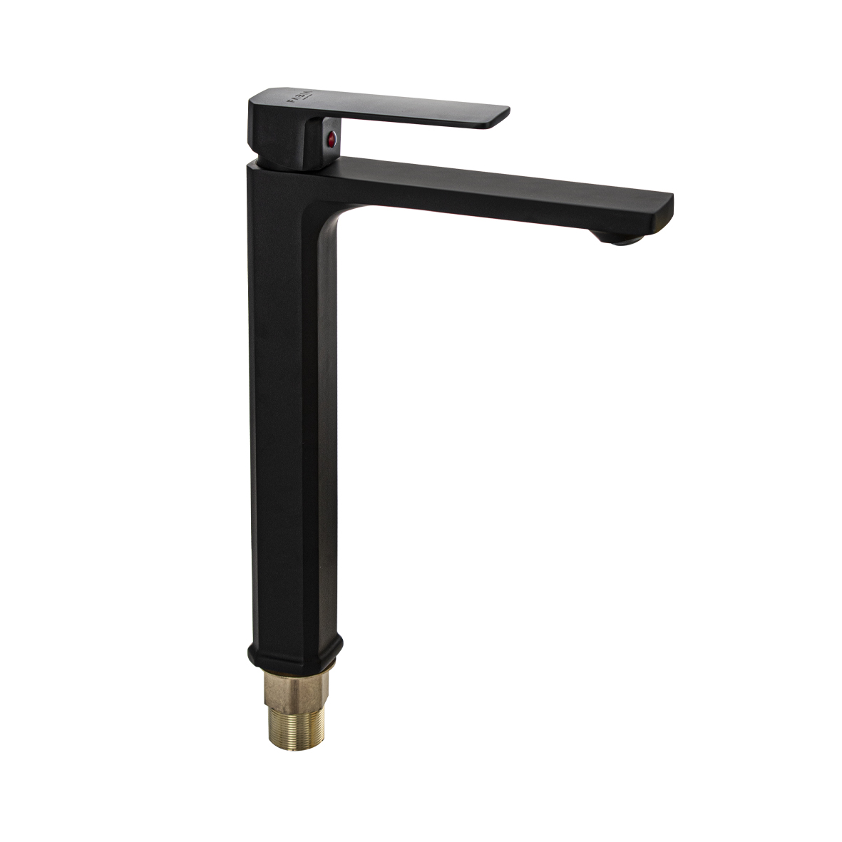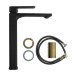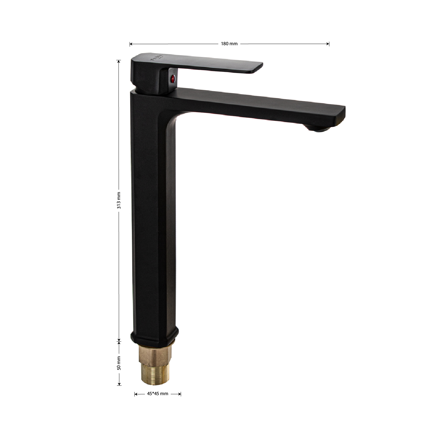 меситель для раковины, квадратный литой корпус, цвет черный, с прямым плоским изливом, ручка литая, шаровый, высокий. Крепление резьба – гайка, картридж d = 35 мм. Аэратор для экономии воды. Такая модель может использоваться на домашней кухне, на даче, в медицинских учреждениях и общественных местах. Габаритные размеры: высота 313 мм, длина 180 мм, посадочное седло 45 мм, длина резьбы 50 мм, длина подводки 500 мм. Вес – 1,92 кг, объём – 0,0051 м3. В комплекте паспорт, корпус, подводка 1/2, крепеж, набор прокладок.