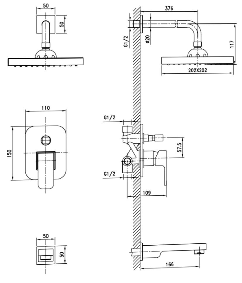 смеситель скрытого монтажа, верхний душ, кронштейн, излив, крепления |