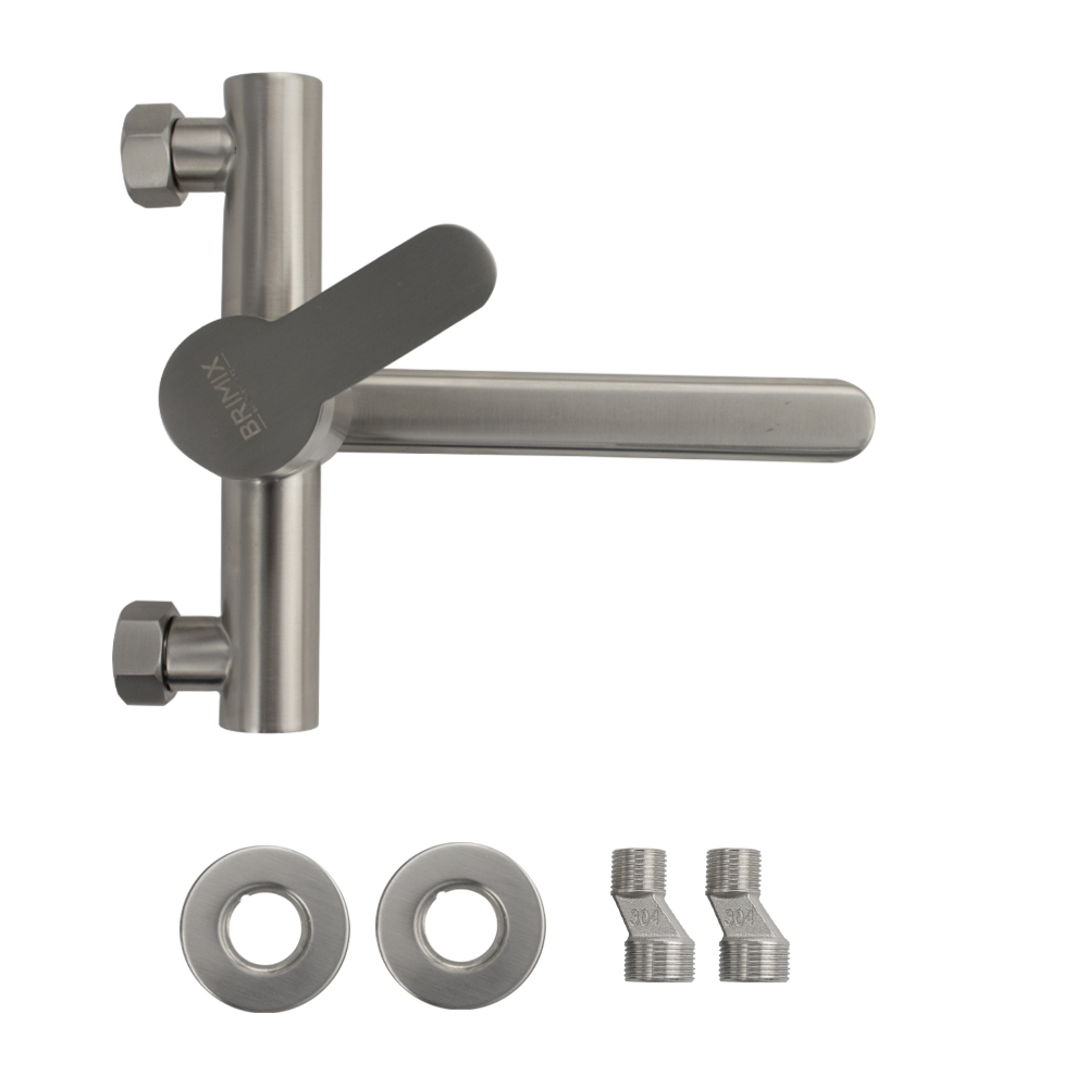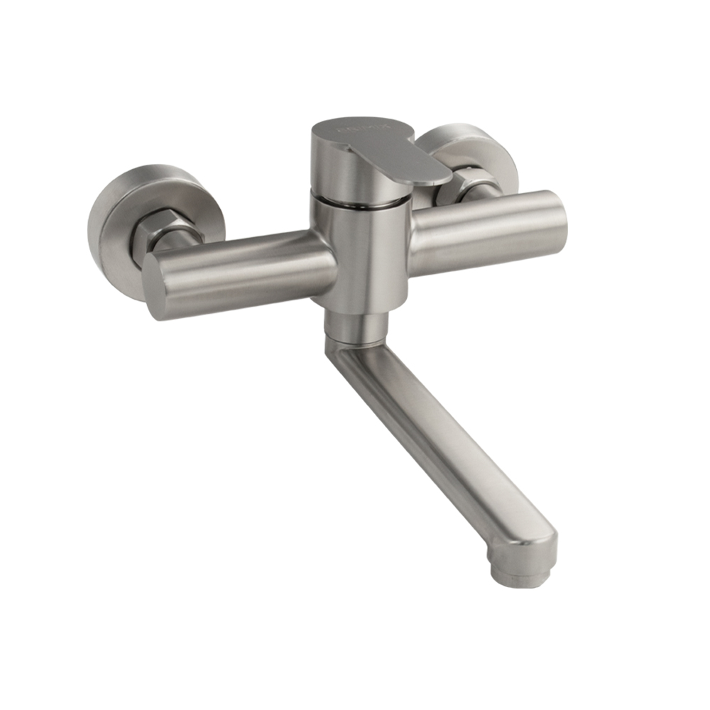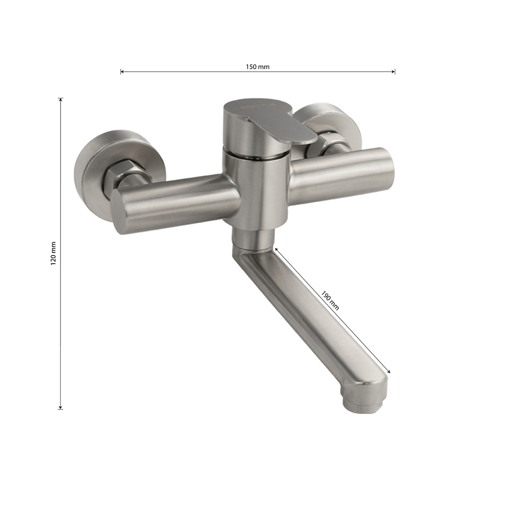 Смеситель для кухонной мойки и раковин, матовый, шаровый, из нержавеющей стали марка 304, массивный корпус с креплением от стены с плоским изливом. Картридж d = 40 мм, ручка литая, аэратор для экономии воды, чашки, гайки и эксцентрики из нержавеющей стали. Габаритные размеры: ширина 150 мм, высота 120 мм, длина излива 190 мм, диаметр чашки 60 мм. Вес – 1,1 кг, объём – 0,0044 м3. В комплекте корпус с изливом, паспорт, крепёж, прокладки