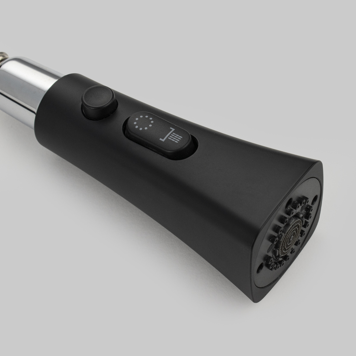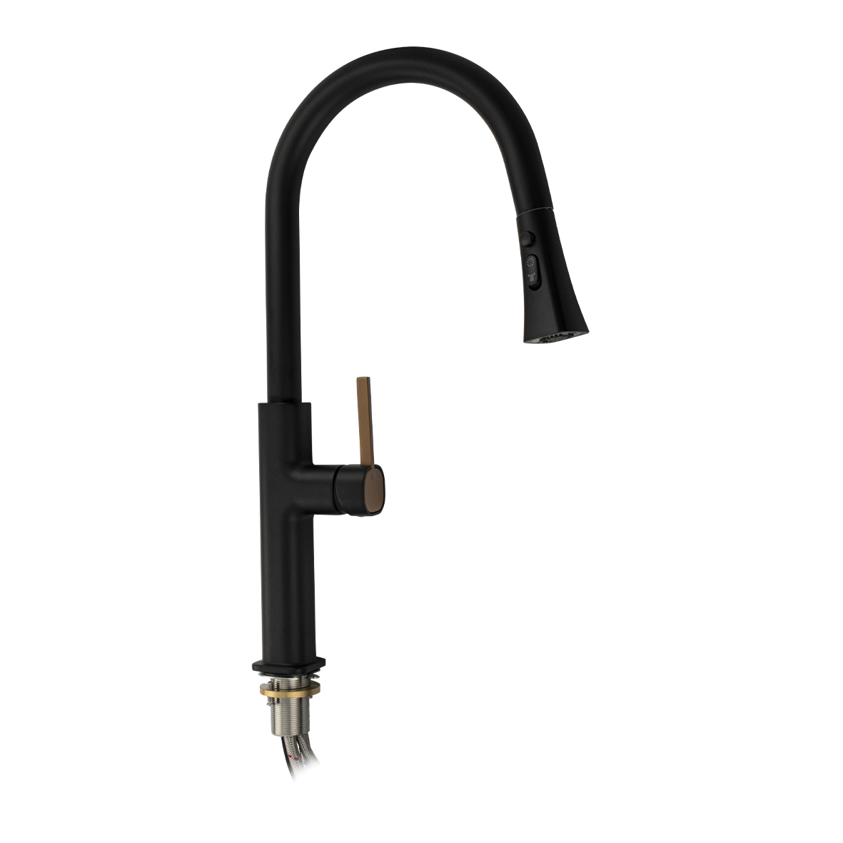 Смеситель для кухонной мойки и раковин, вытяжной излив – лейка с переключением режимов подачи воды, литой черный корпус, из латуни , шаровый. Крепление резьба – гайка, картридж d = 35 мм, ручка литая. Аэратор для экономии воды. Такая модель может использоваться на домашней кухне, на даче, в медицинских учреждениях и общественных местах. Габаритные размеры: высота мм, длина мм, диаметр посадочного седла мм, длина резьбы мм, длина подводки мм. Вес – кг, объём – 0, м3. В комплекте паспорт, корпус с изливом, подводка 1/2, крепеж, набор прокладок.