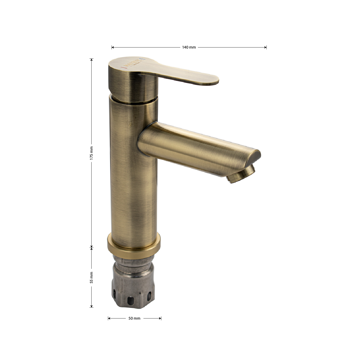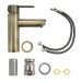Смеситель для раковины, матовый литой корпус под бронзу, из нержавеющей стали марки 201, с коротким литым изливом, литая ручка, шаровый. Крепление резьба – гайка, картридж d = 35 мм. Аэратор для экономии воды. Такая модель может использоваться на домашней кухне, на даче, в медицинских учреждениях и общественных местах.Габаритные размеры: высота 175 мм, длина 140 мм, диаметр посадочного седла 50 мм, длина резьбы 55 мм, длина подводки 450 мм. Вес – 0.8 кг, объём – 0.002 м3. В комплекте паспорт, корпус, подводка 1/2, крепеж, набор прокладок