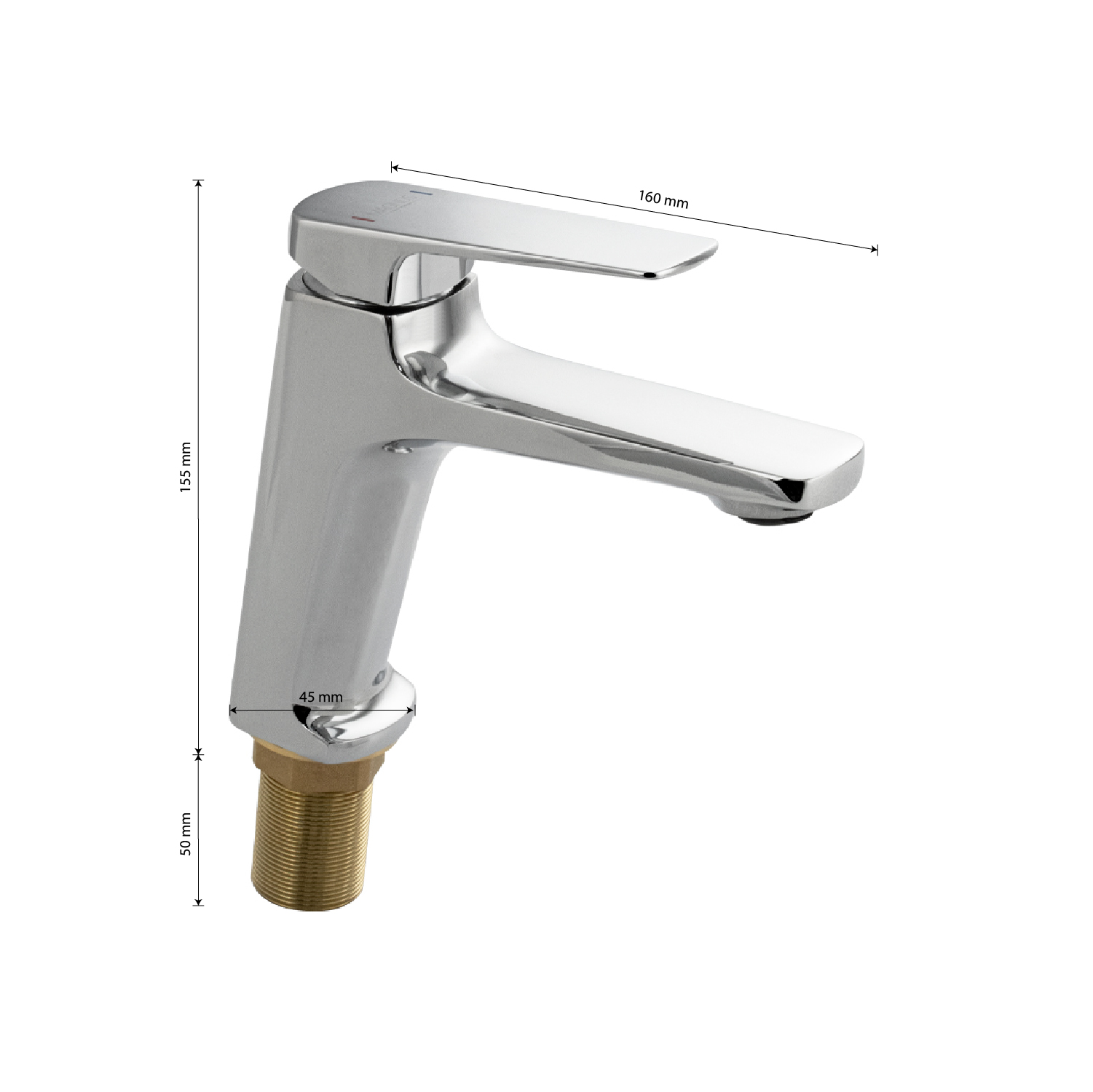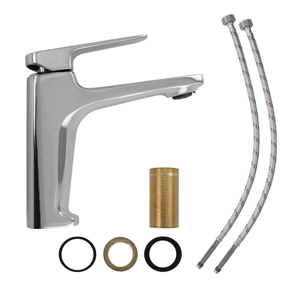 Смеситель для раковины, латунный квадратный корпус, хромированный, с коротким изливом, литой корпус, литая ручка, шаровый. Крепление резьба – гайка, картридж d = 40 мм. Аэратор для экономии воды. Габаритные размеры: высота 155 мм, длина излива 160 мм, диаметр посадочного седла 45 мм, длина резьбы 50 мм, длина подводки 500 мм. Вес – 1,200 кг, объём – 0,00300 м3. В комплекте паспорт, корпус, подводка 1/2, крепеж, набор прокладок.