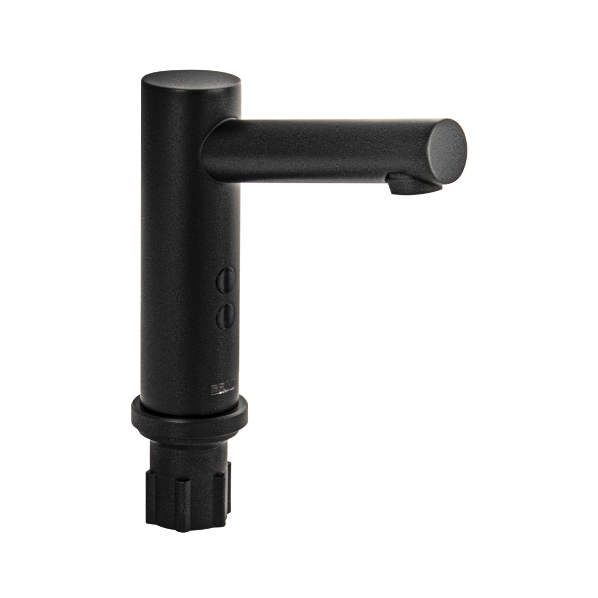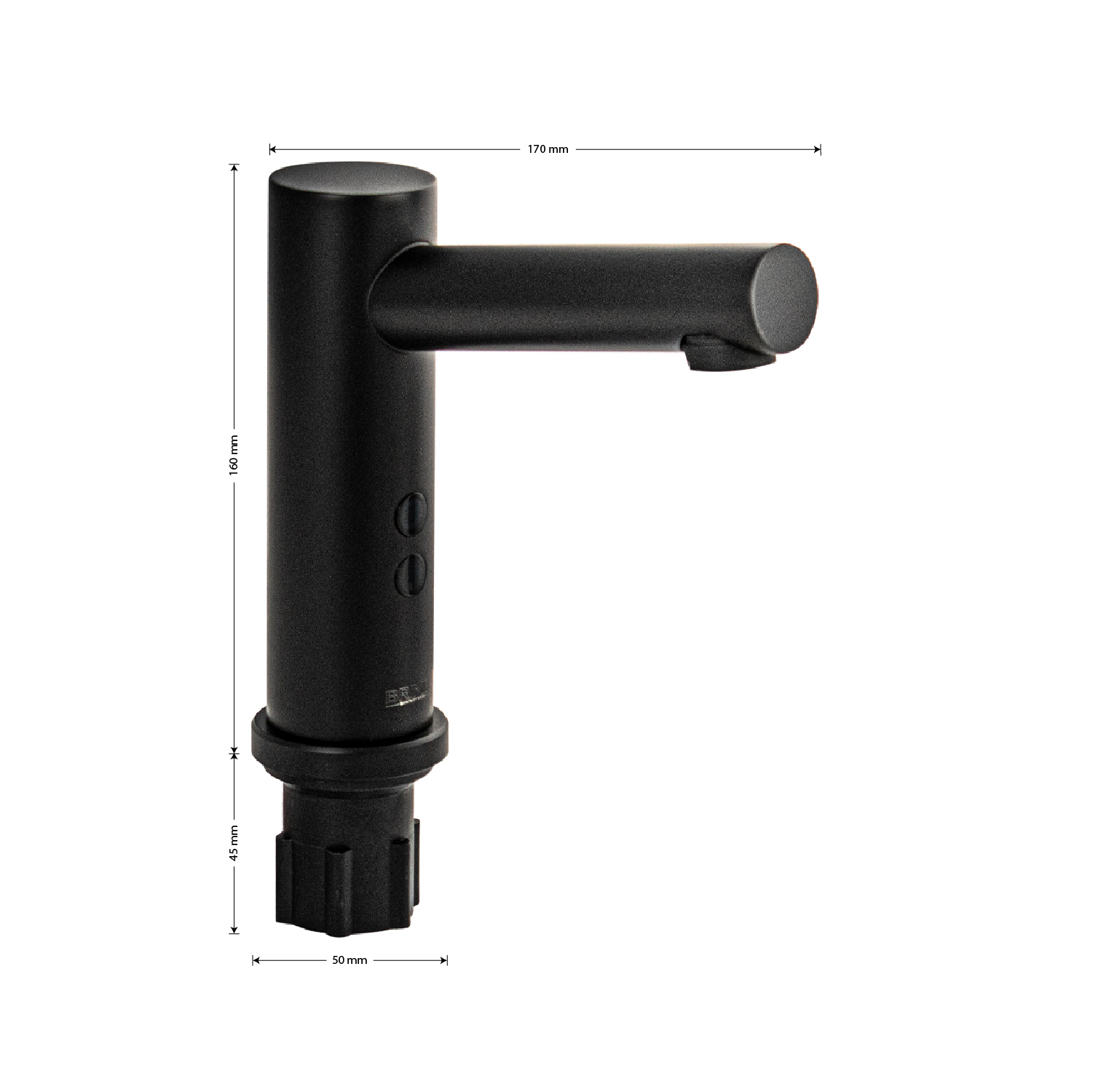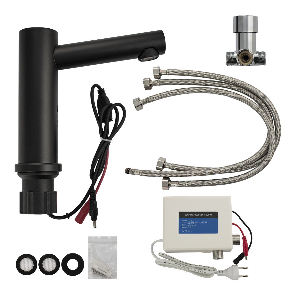 Сенсорный смеситель на раковину предназначен для монтажа в жилых домах и общественных помещениях. С возможностью подключения к сети и работы от батареек. Изделие выполнено в стиле хай-тек из высококачественного материала – нержавеющая сталь, черный матовый цвет обеспечивает устойчивость к механическим воздействиям. Кран смешивания горячей и холодной воды с возможностью регулировки размещается под столешницей. Кран включится, если поднести руки к изливу. Бесконтактный принцип работы гарантирует гигиеничность устройства. Устройство снабжено аэратором, позволяющей очистку без использования дополнительных средств. Он насыщает воду воздухом для создания струи, комфортной для гигиенических процедур, и сокращения расхода ценного ресурса. Сенсорный смеситель включает поток воды за счет фотоэлемента. Универсальное питание DC 6V (4 батареи типа “АА”, в комплектацию не входят), AC/DC 6V AC 220V (50/60Hz). Габаритные размеры: диаметр посадочного седла 50 мм, высота 160 мм, длина излива 170 мм. Вес – 1,85 кг, объём – 0,0