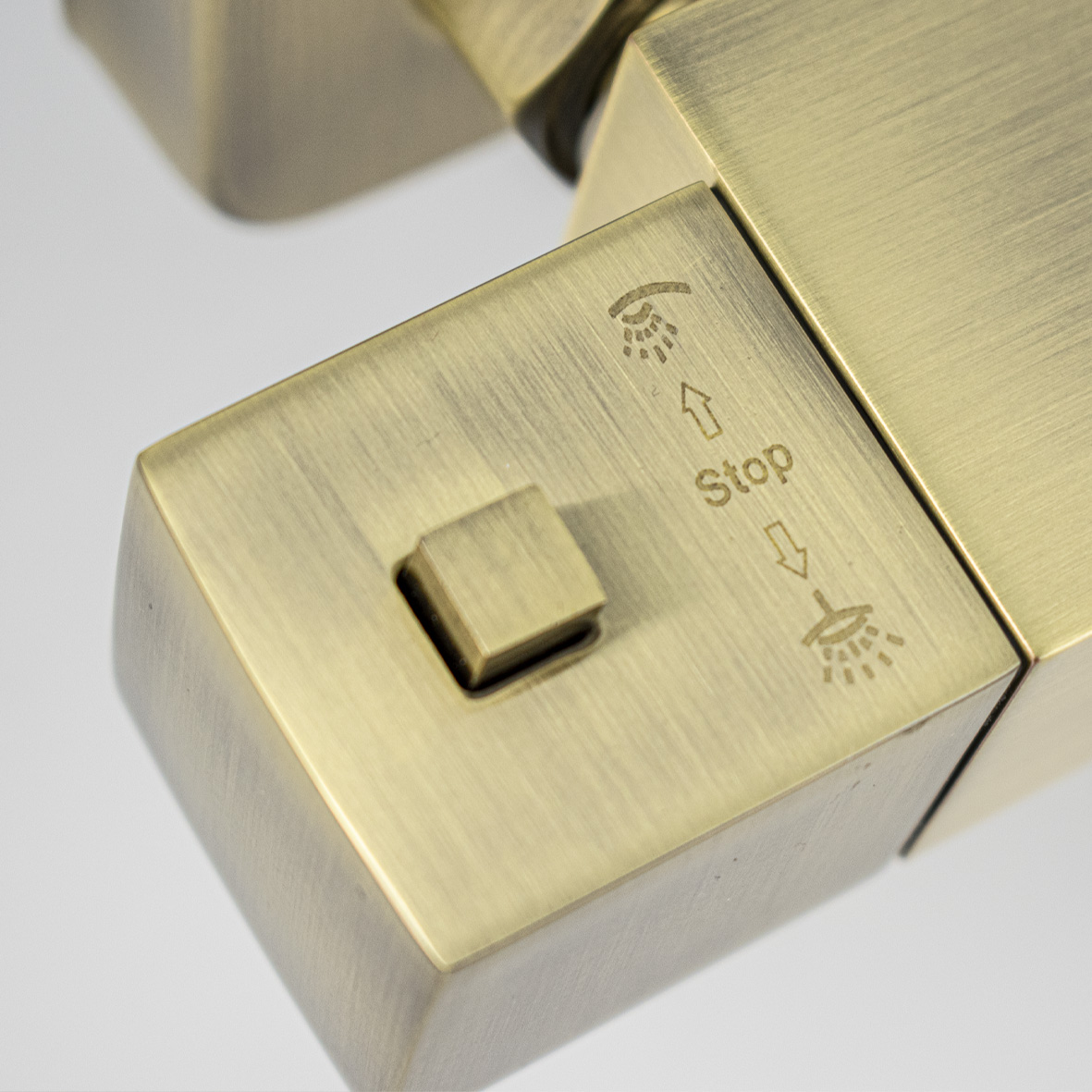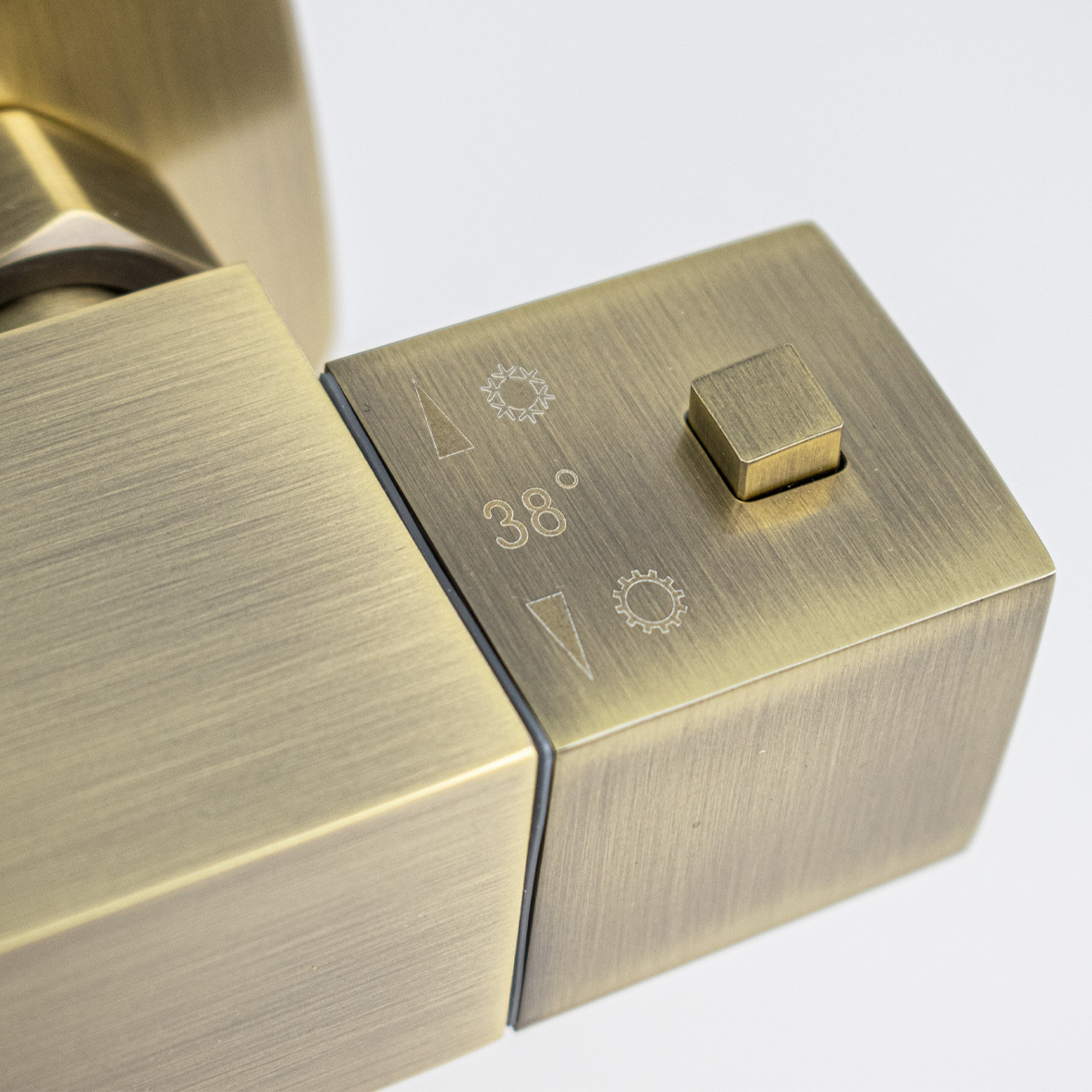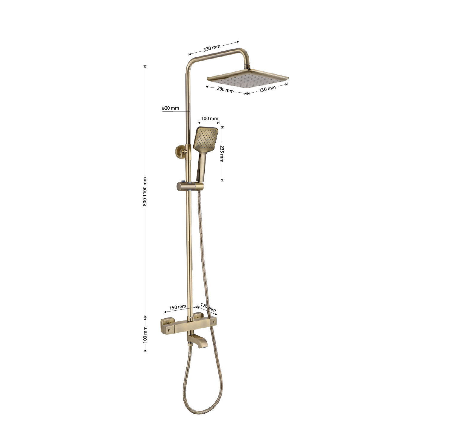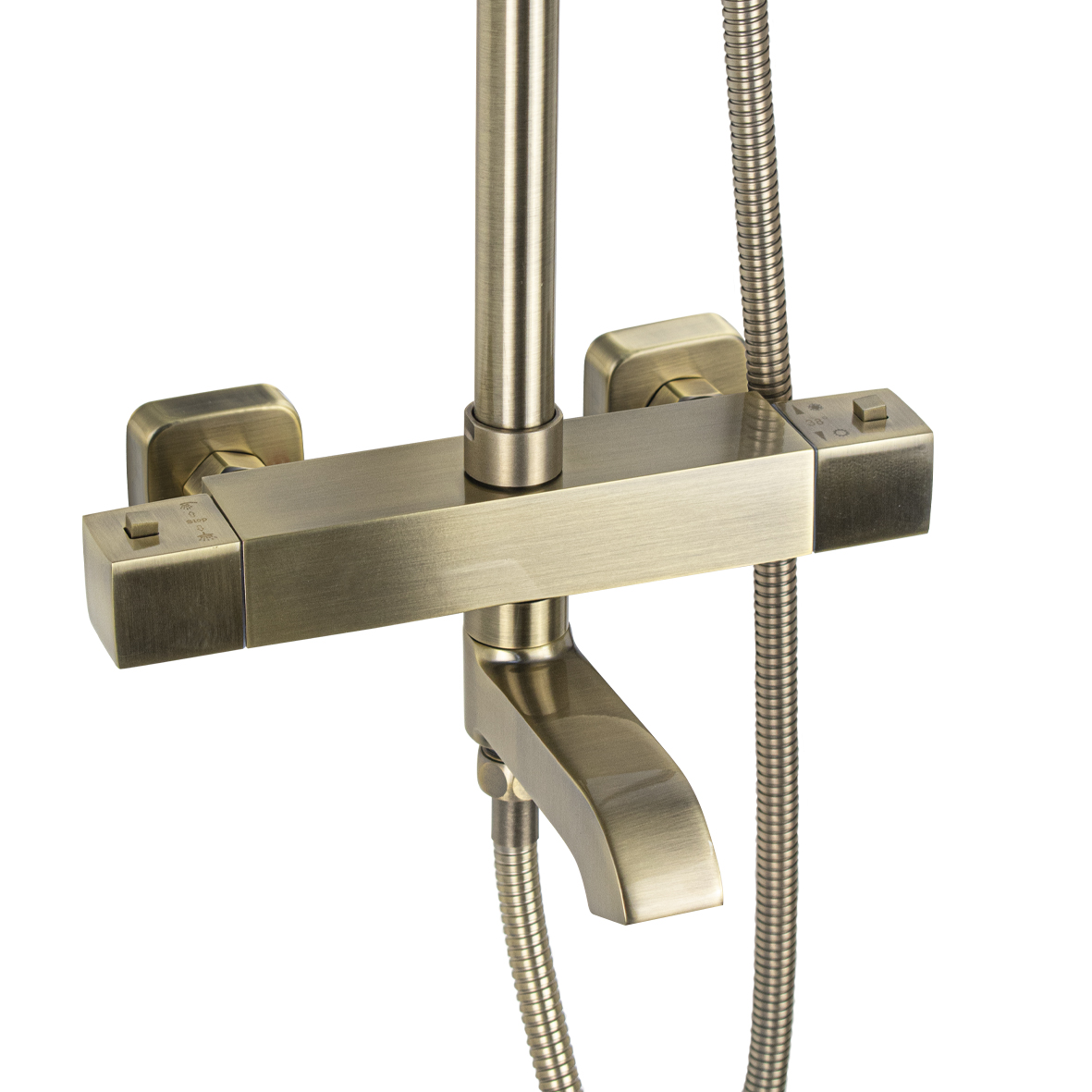 Смеситель с термостатом стойка душевая телескопическая “тропический душ” – надежное сантехническое оборудование. Латунный, квадратный массивный корпус под бронзу с коротким изливом, поворот которого является переключением подачи воды. Температура и напор воды устанавливаются поворотом двух удобных рукояток. Термостат поддерживает заданную температуру воды и может работать в системах низкого давления с газовыми проточными водонагревателями. Ограничитель температуры до 38 градусов спасает от возможного ожога при случайном повороте рукоятки. Встроенный аэратор формирует комфортный и приятный поток воды. Сеточка легко снимается для удаления налета. Аксессуар оснащен термостатическим картриджем с шумоподавлением и керамической кран-буксой, стойка с двумя квадратными лейками и шланг. Габаритные размеры: высота стойки 800 – 1100 мм, длина излива стойки 330 мм, лейка для душа 100 мм двухрежимная, лейка тропического душа 230*230 мм, длина гусака 170 мм, шланг 150 см. Вес – 4.85 кг, объём – 0,035 м3. В комплекте корпус, стойка, 2 лейки, шланг, паспорт и комплект прокладок