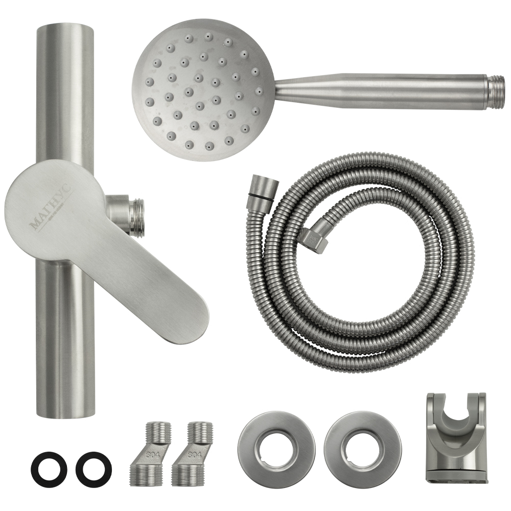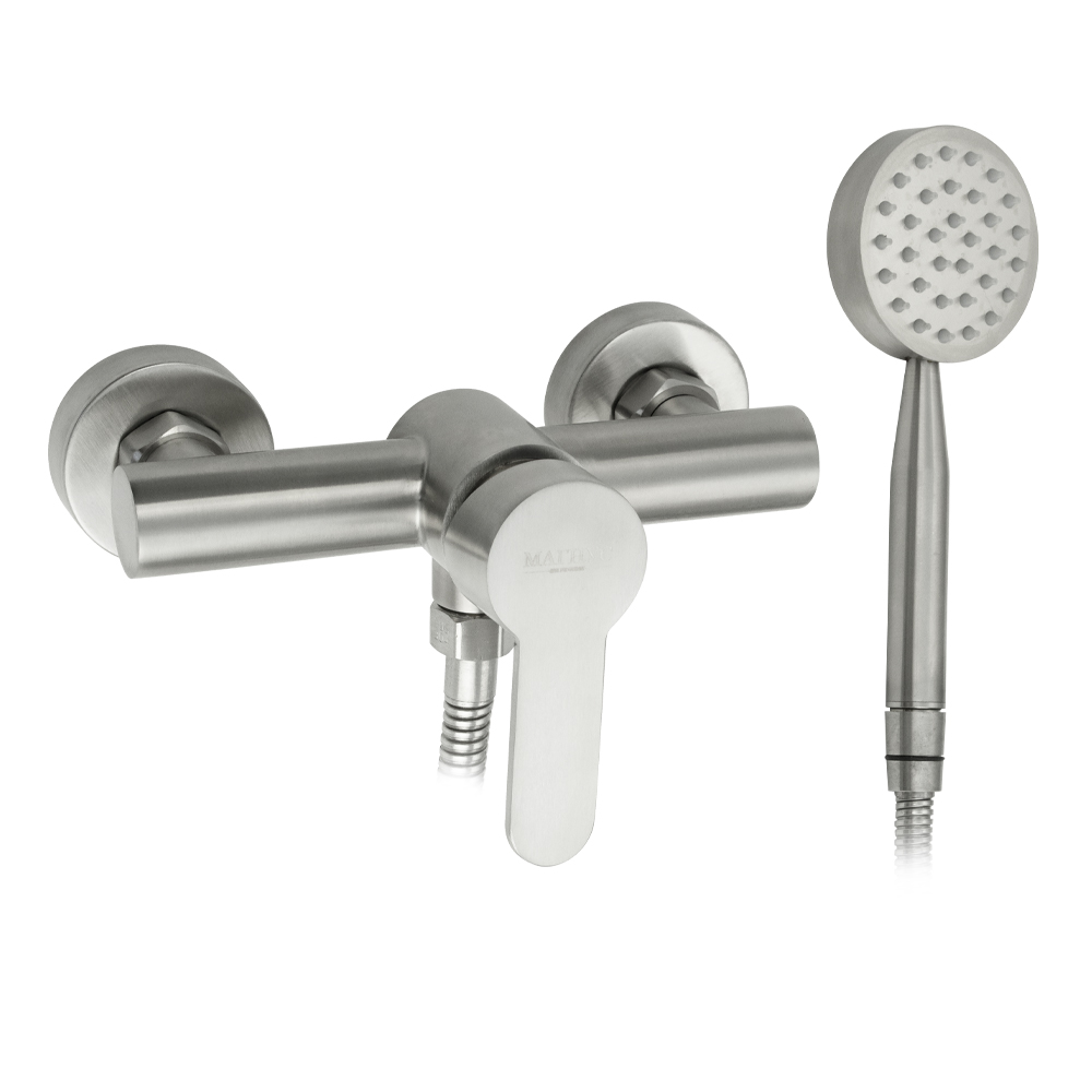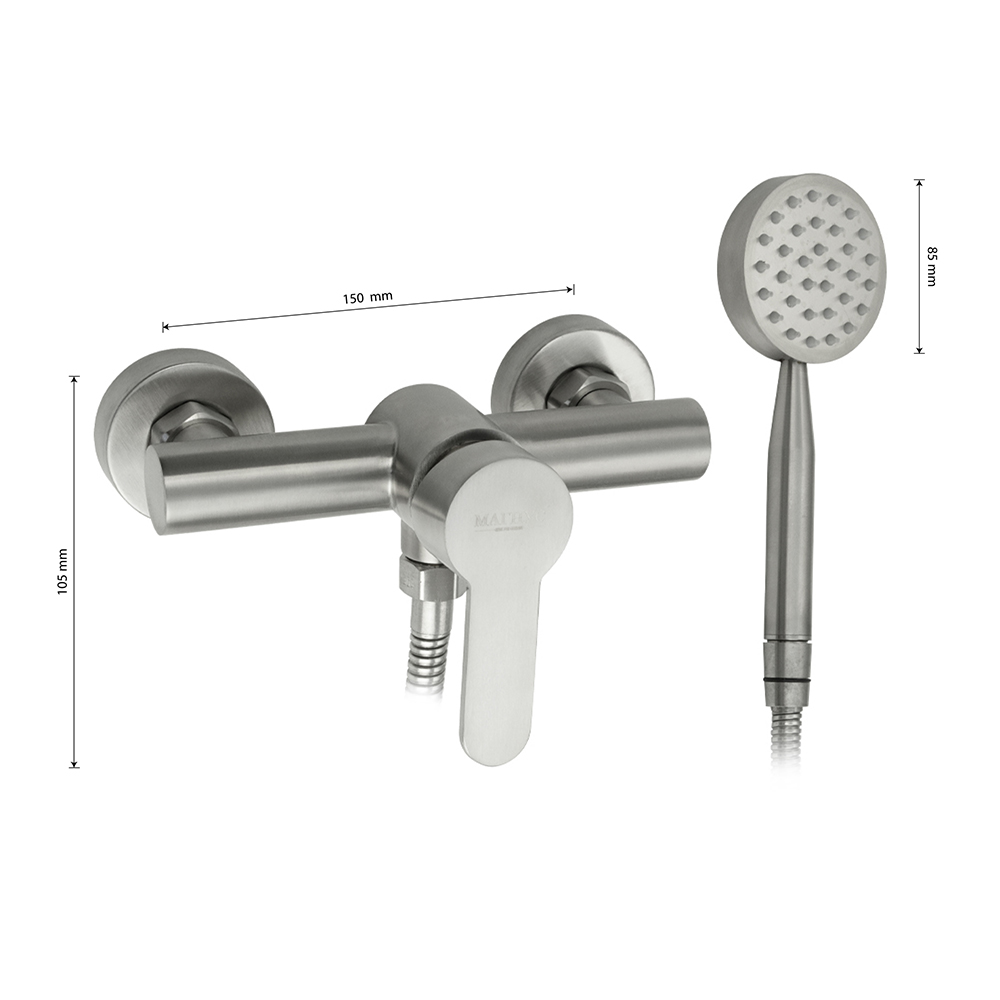 Смеситель матовый из нержавеющей стали марки 304, в ванную / душевую комнату / кабинку, без излива, литой корпус, шаровый. Картридж d = 40 мм, литая ручка, чашки и эксцентрики. Габаритные размеры: ширина 150 мм, высота корпуса 105 мм, душевая лейка d = 85 мм, шланг 150 см. Вес – 1,500 кг, объём – 0,00730 м3. В комплекте паспорт, корпус, душевая лейка, шланг, кронштейн, комплект крепежа и прокладок.