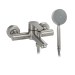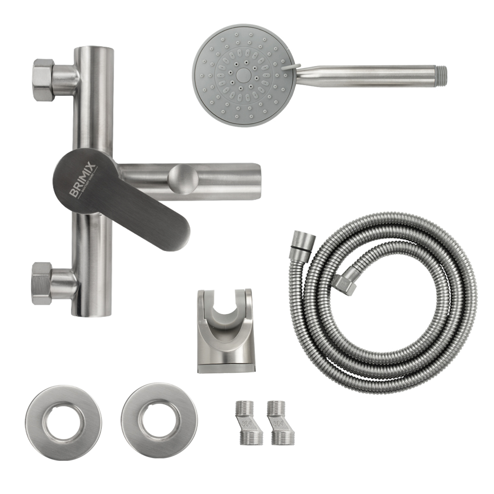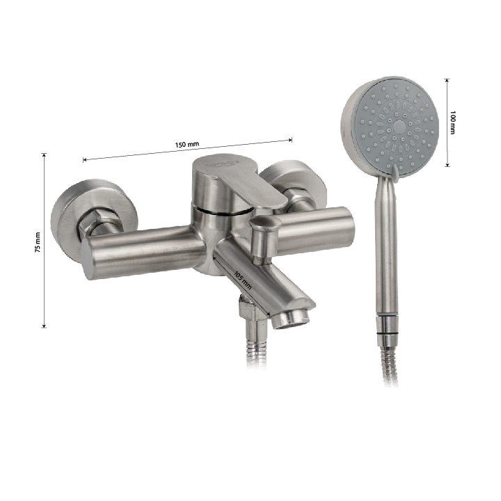 Смеситель матовый из нержавеющей стали марки 304 в ванную / душевую комнату, с коротким литым изливом. Картридж d = 35 мм, ручка литая. Дутый, большой корпус с дивертором м/к на корпусе, аэратор для экономии воды, чашки нержавеющая сталь, гайки и эксцентрики из нержавеющей стали. Габаритные размеры: ширина 150 мм, высота 75 мм, длина излива 105 мм, диаметр чашки 60 мм, длина шланга 150 см, лейка d = 100 мм. Вес – 1,81 кг, объём – 0,00600 м3. В комплекте корпус с изливом, дивертор, кронштейн, паспорт, крепёж, прокладки, лейка, шланг.