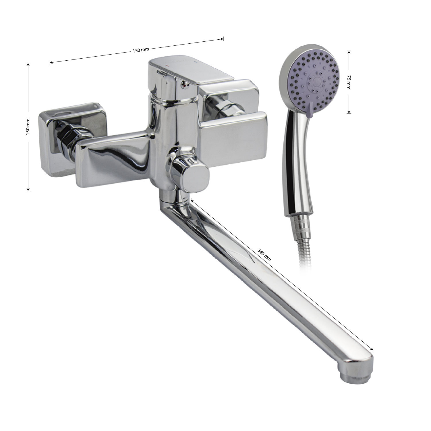 Смеситель в ванную / душевую комнату, латунный прямоугольный корпус, хромированный, с длинным плоским изливом, шаровый, с дивертором м/к на корпусе. Картридж d = 40 мм, литая ручка, аэратор для экономии воды, чашки и эксцентрики. Габаритные размеры: ширина 150 мм, высота корпуса 140 мм, длина излива 340 мм, круглая трёхрежимная душевая лейка 75 мм, шланг 150 см. Вес – 2,000 кг, объём – 0,00864 м3. В комплекте паспорт, корпус с изливом, дивертор, душевая лейка, шланг, кронштейн, комплект крепежа и прокладок.
