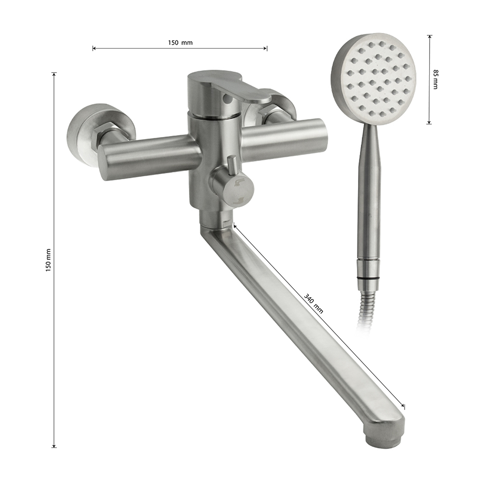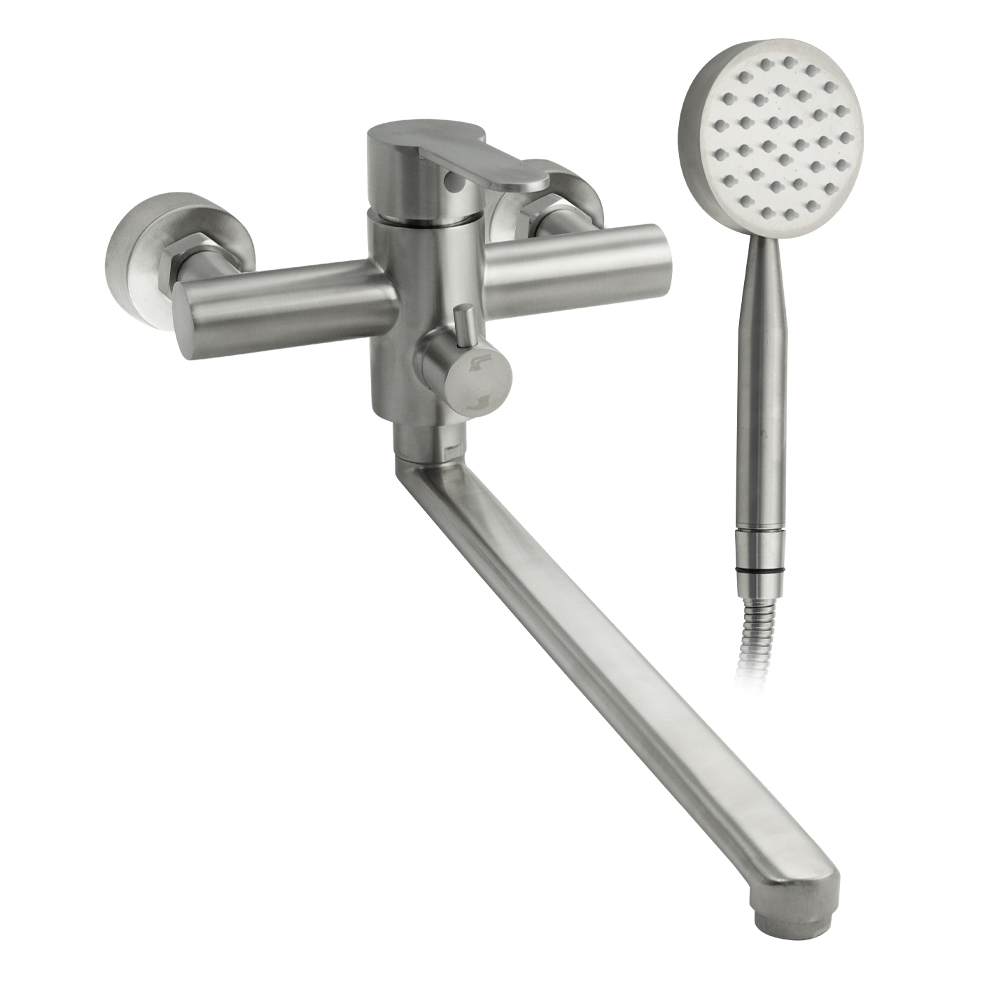 Смеситель матовый, из нержавеющей стали марки 304 в ванную / душевую комнату, с поворотным длинным плоским изливом. Картридж d = 35 мм, ручка литая. Дутый, большой круглый корпус с дивертором м/к на корпусе, аэратор для экономии воды, чашки, гайки и эксцентрики из нержавеющей стали. Габаритные размеры: ширина 150 мм, высота 150 мм, длина излива 340 мм, диаметр чашки 60 мм, длина шланга 150 см, лейка d = 85 мм. Вес – 2,400 кг, объём – 0,00865 м3. В комплекте корпус с изливом, дивертор, кронштейн, паспорт, крепёж, прокладки, лейка, шланг.