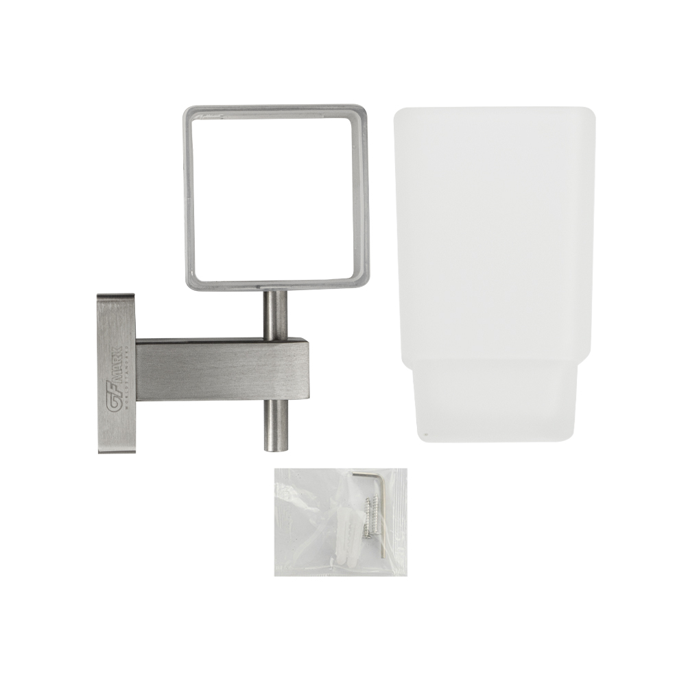 Стакан стеклянный с креплением к стене, квадратной формы на основании. Изделие выполнено из матового стекла и металла с матовым покрытием Изготовлен из прочной нержавеющей стали марки SUS 304 с матовым покрытием, которое придает безупречный стильный вид и долговечность. Идеально подойдет не только для ванной, но и для кухни. Изделие крепится к стене с помощью дюбелей и саморезов (входят в комплект). Габаритные размеры: высота стакана 110 мм, общая ширина 110 мм, основание 50*50 мм.